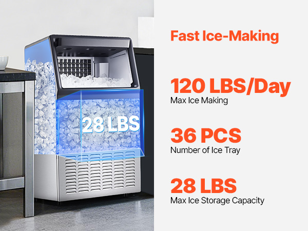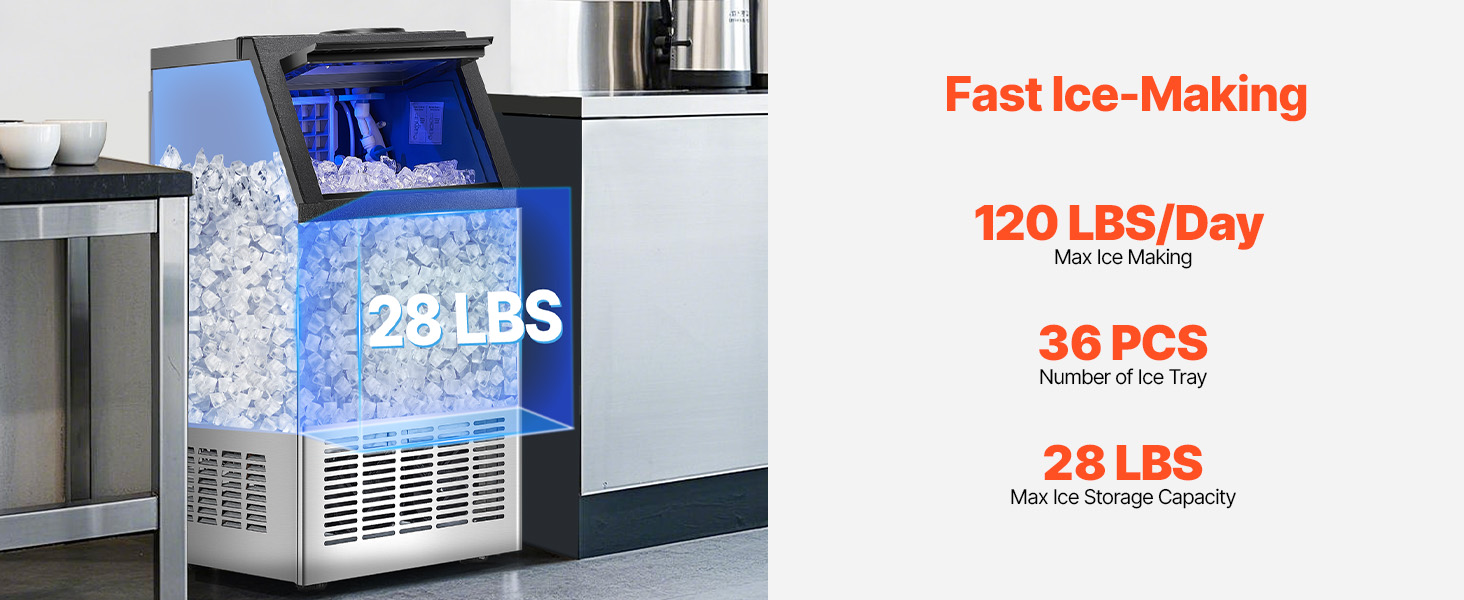 VEVOR 120lbs/24H Commercial Ice Maker, 36 Ice Cubes in 15 Minutes, Freestanding Ice Maker Machine with 28lbs Large Storage Capacity for Bar Office Restaurant, with LED Digital Display & Self-Cleaning