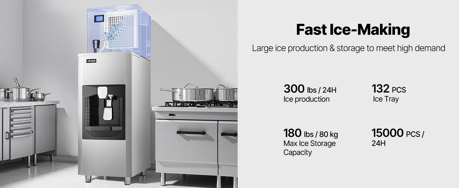 VEVOR Commercial Ice Maker, 300 Lbs/Day Ice Maker Machine, 180 Lbs Large Ice Storage Bin with 20 Lbs/Min Automatic Ice Dispensing, Self-Cleaning Ice Machine with Touchscreen for Bar, Cafe, Restaurant