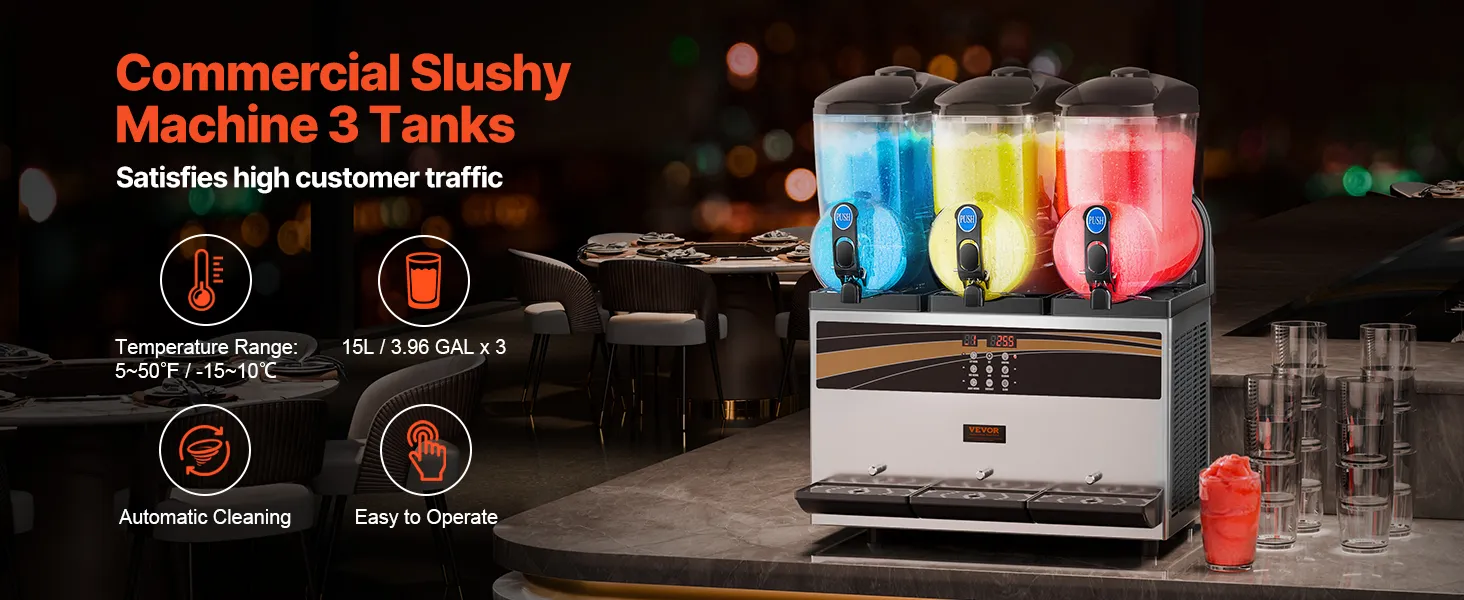With three 15L / 3.96 GAL capacity tanks, this slushy machine can make approximately 180 cups of slushy drinks per batch, you can choose to use each tank independently (recommended sugar content: around 13%, alcohol content: below 13%). It requires less frequent refilling, making it perfect for high-traffic commercial use. The transparent tank beautifully showcases colorful drinks, making it a great fit for ice cream shops, burger joints, cafes, bars, and other commercial settings.