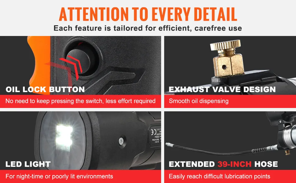 The grease gun's LED light keeps you going in low-light conditions. The 39-inch extended hose lets you reach those tricky spots with ease. Every detail is about making your work more convenient and efficient.