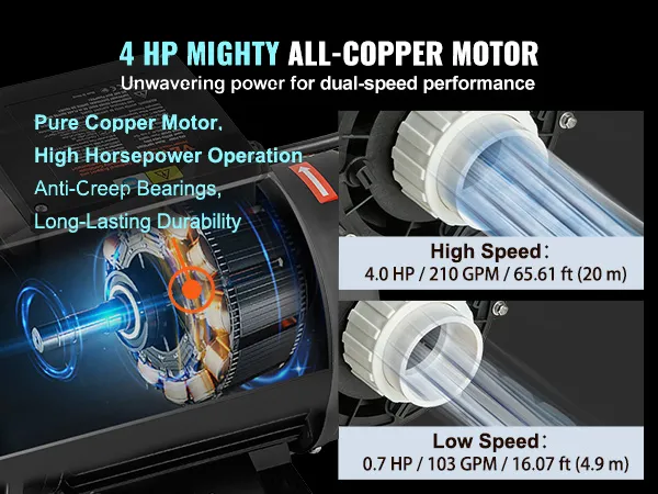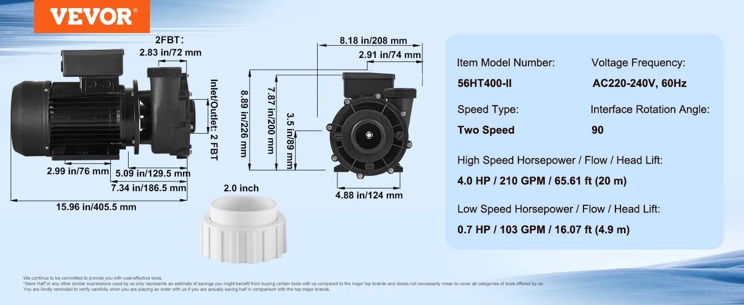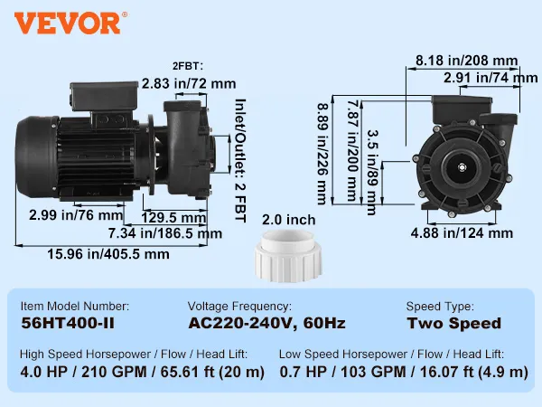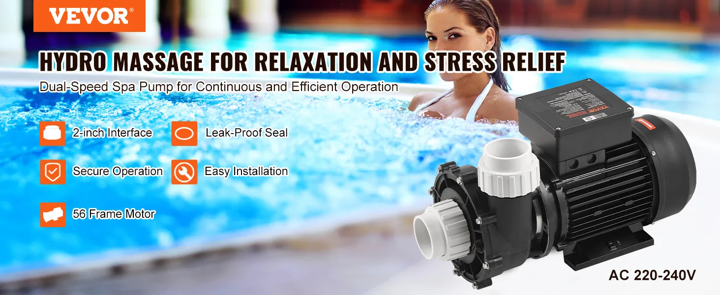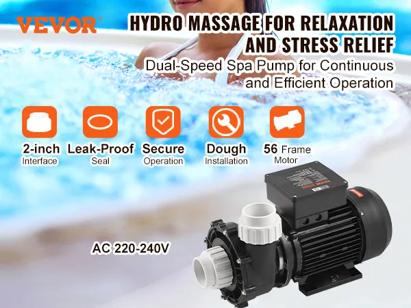 Vevor Dual-speed Spa Pump, 56-frame Hot Tub Pump, 1900W / 43 M³/H / 18 M High Speed Or 450W / 21.5 M³/H / 4.4 M Low Speed, 2 In/5.6CM Connectors 90° Rotational Interface Anti-leakage Overheat Automatic Power-off Protection For Home Spas, Outdoor Spas, Underground Spas