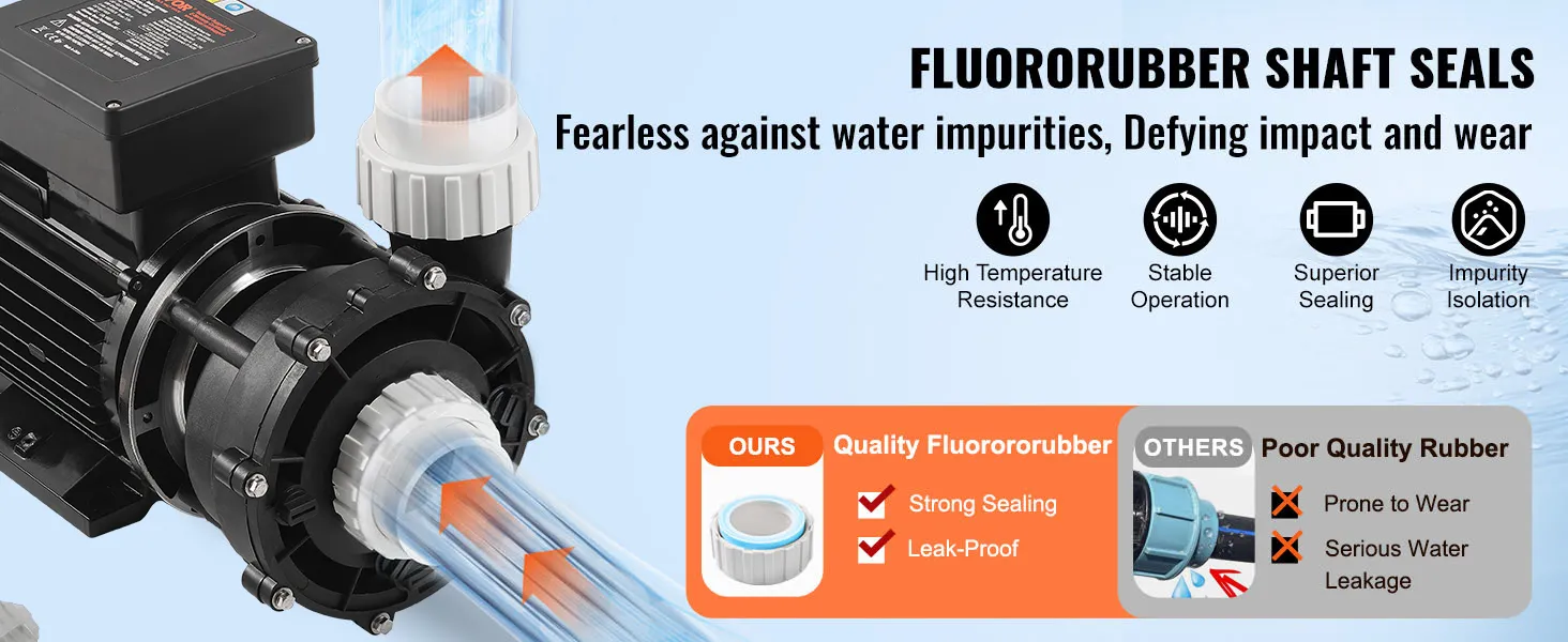 Anti-leakage is the key to the SPA pump for hot tubs, so we only use Fluororubber shaft seals, which have good resistance to high temperature, corrosion, oil, and aging and are able to maintain stable sealing performance in harsh working environments.