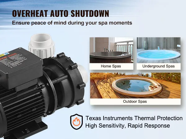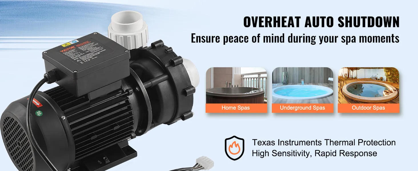 This hot tub SPA pump features Texas Instruments thermal protection, characterized by high precision, fast response, and low power consumption. When the motor temperature exceeds the set value, it will automatically disconnect the circuit to protect the motor from damage.
