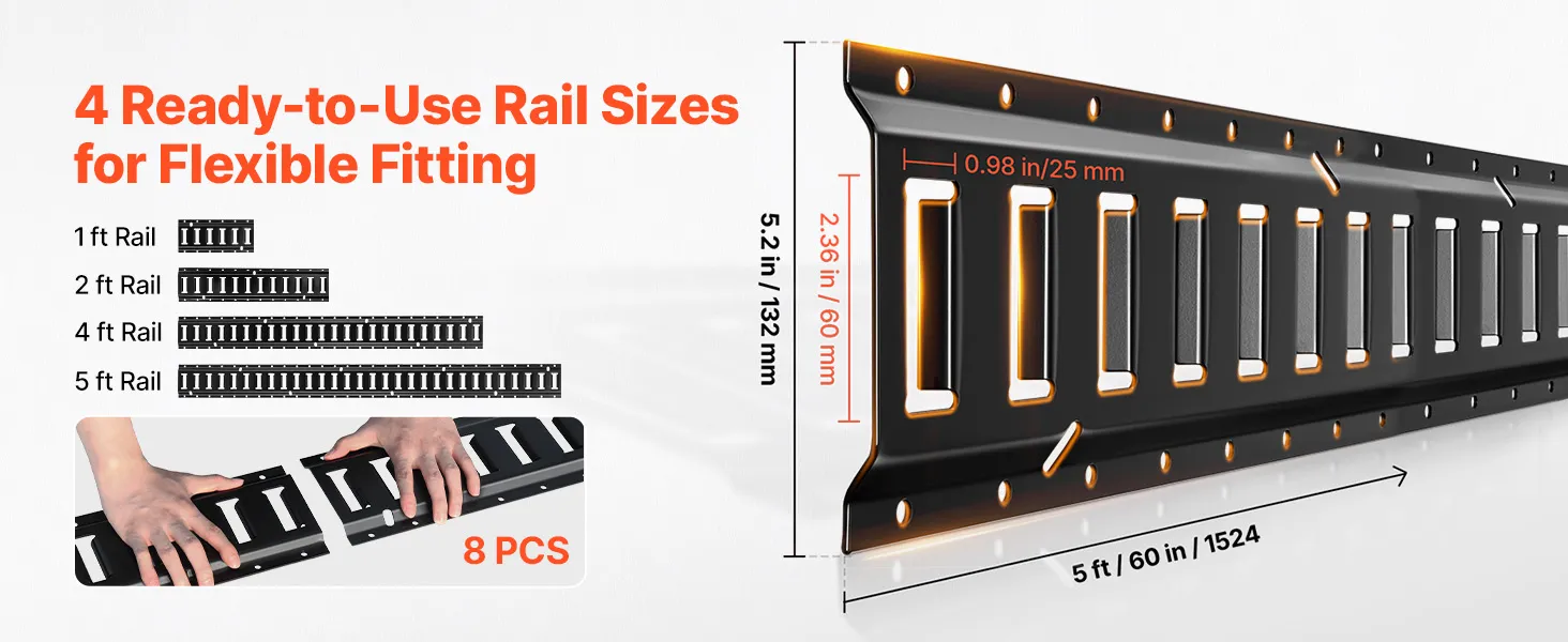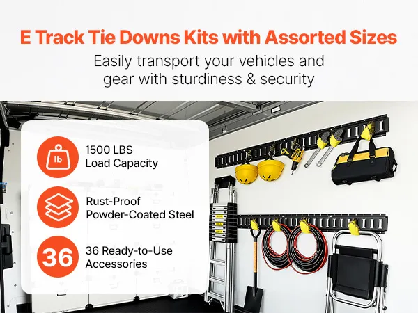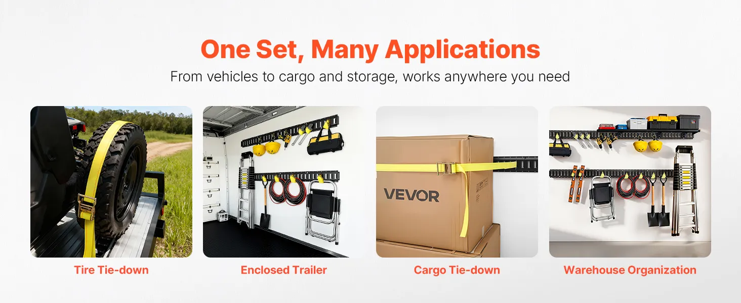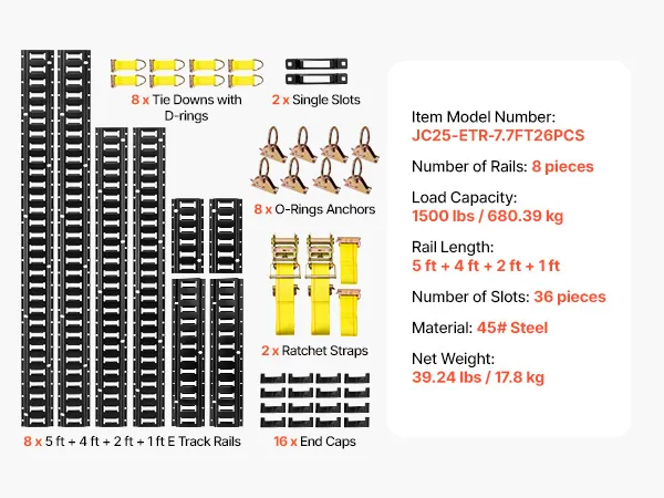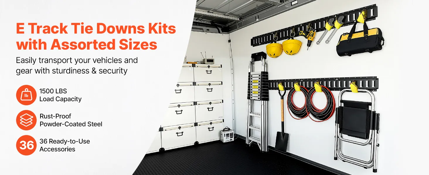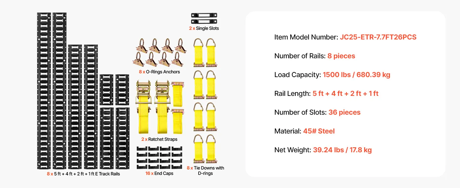 VEVOR E-Track Tie-Down Rail Kit, 8 Pack (1.5m+1.2m+0.6m+0.3m) E Track Rails, 36 Pcs Includes 2 Ratchet Straps & 8 O-Rings & 8 Tie-Offs with D-Ring & 2 Single Slots & 16 End Caps, Fit for Vans Trailers
