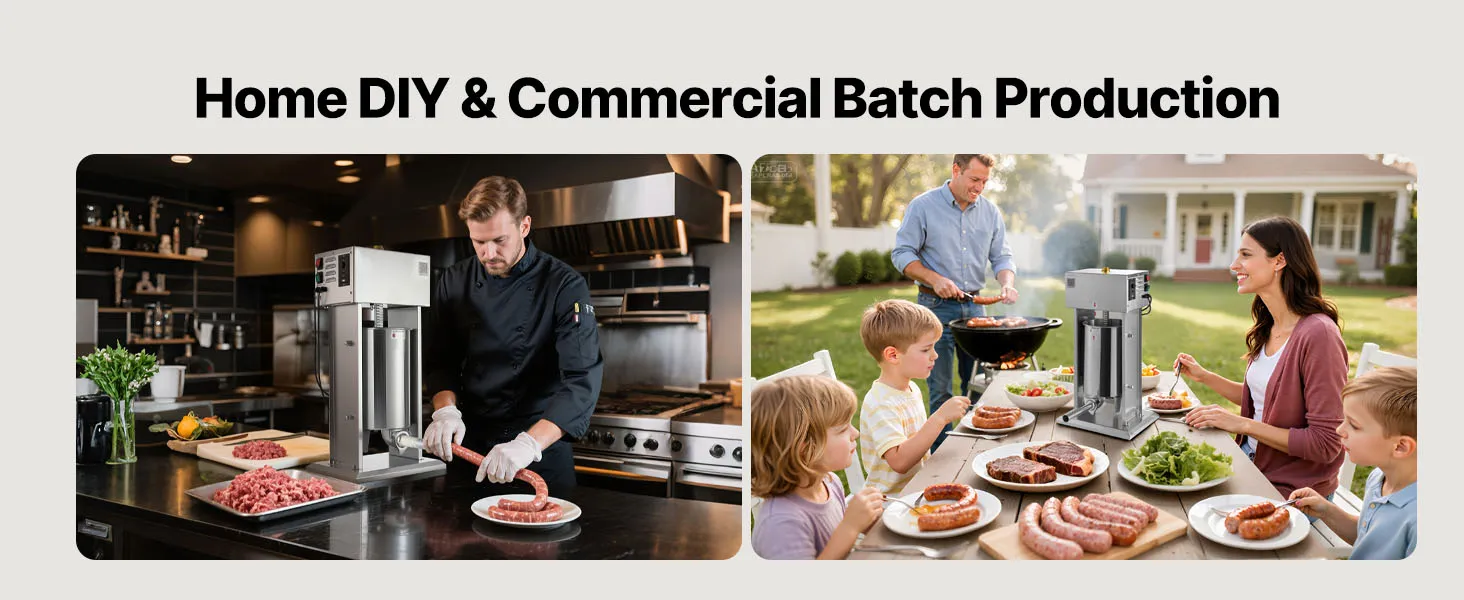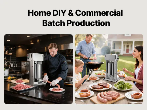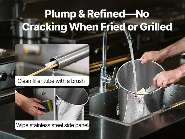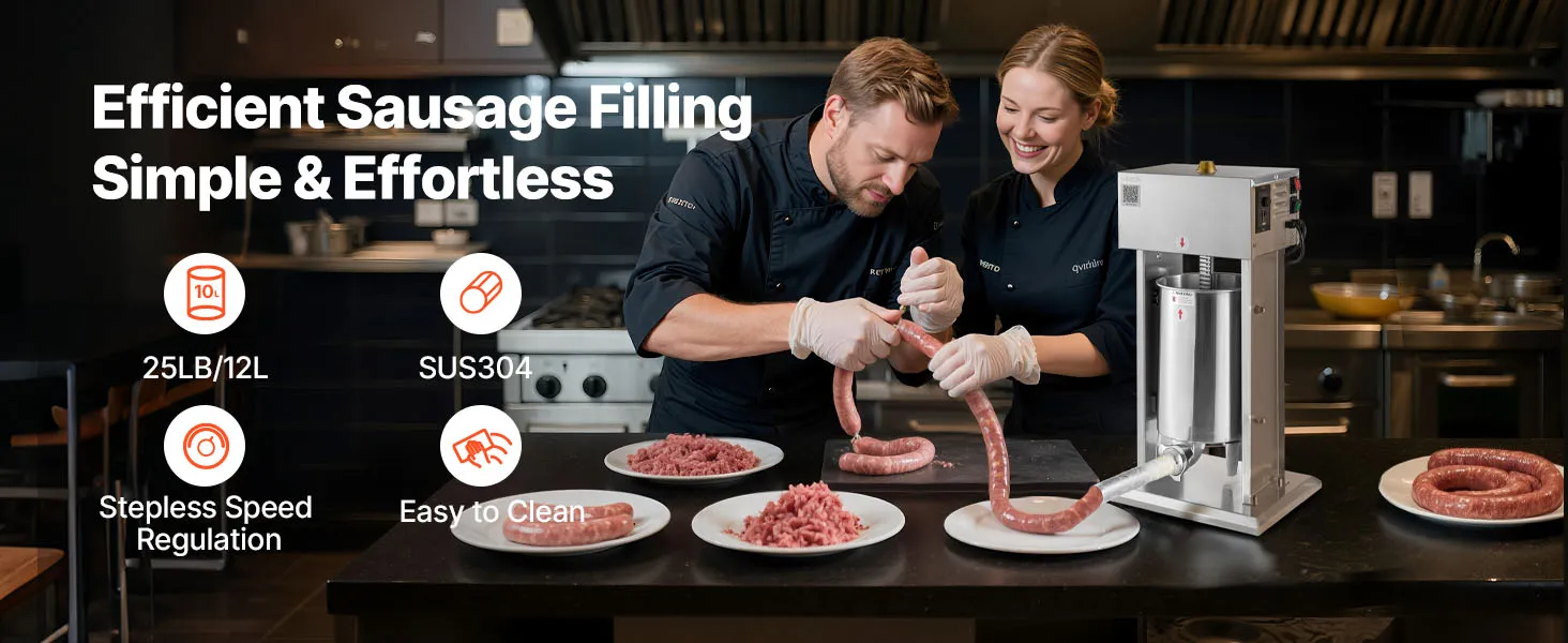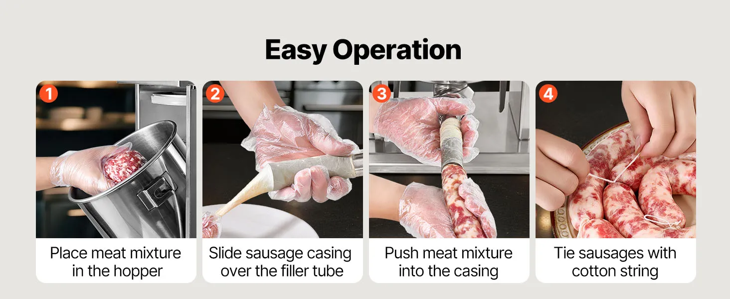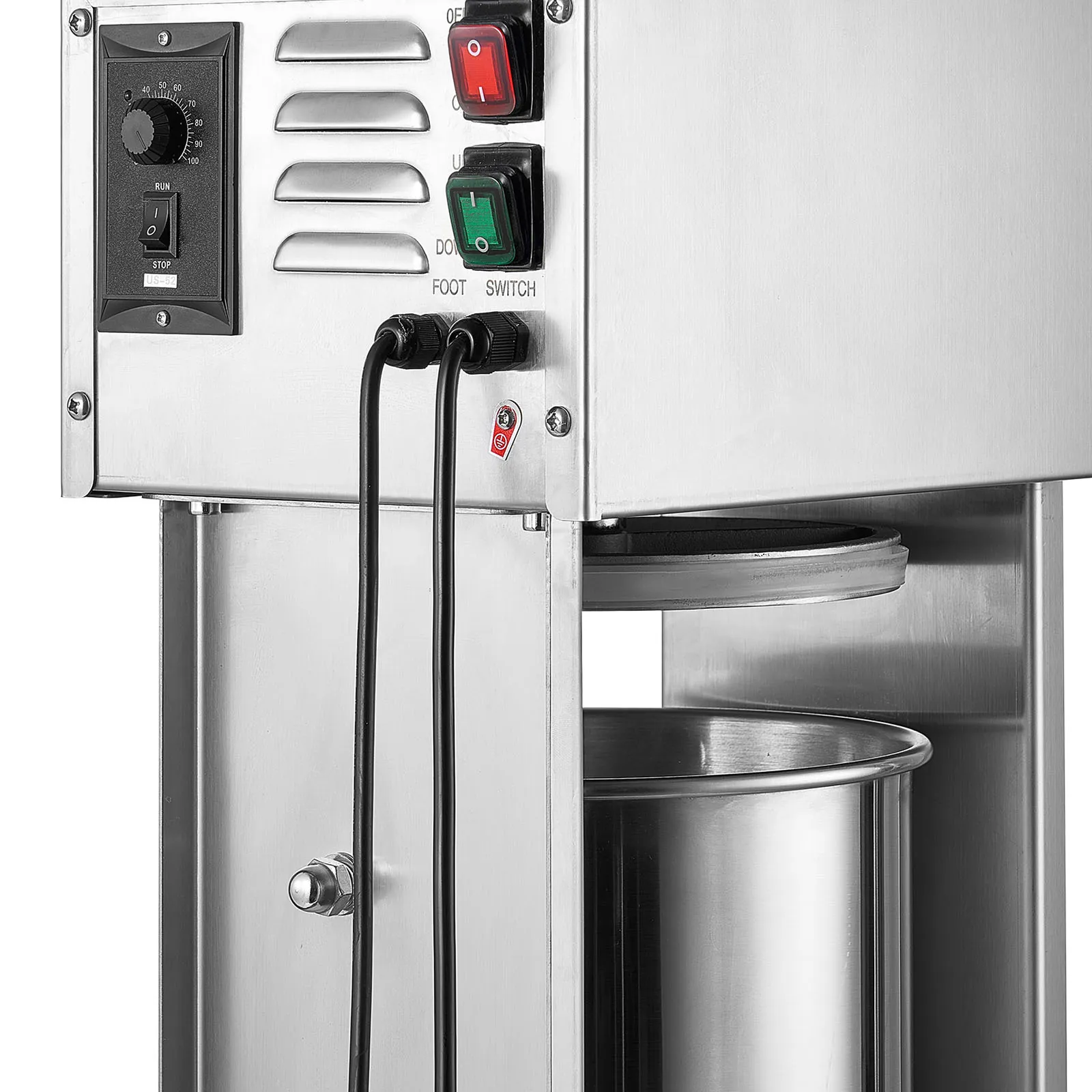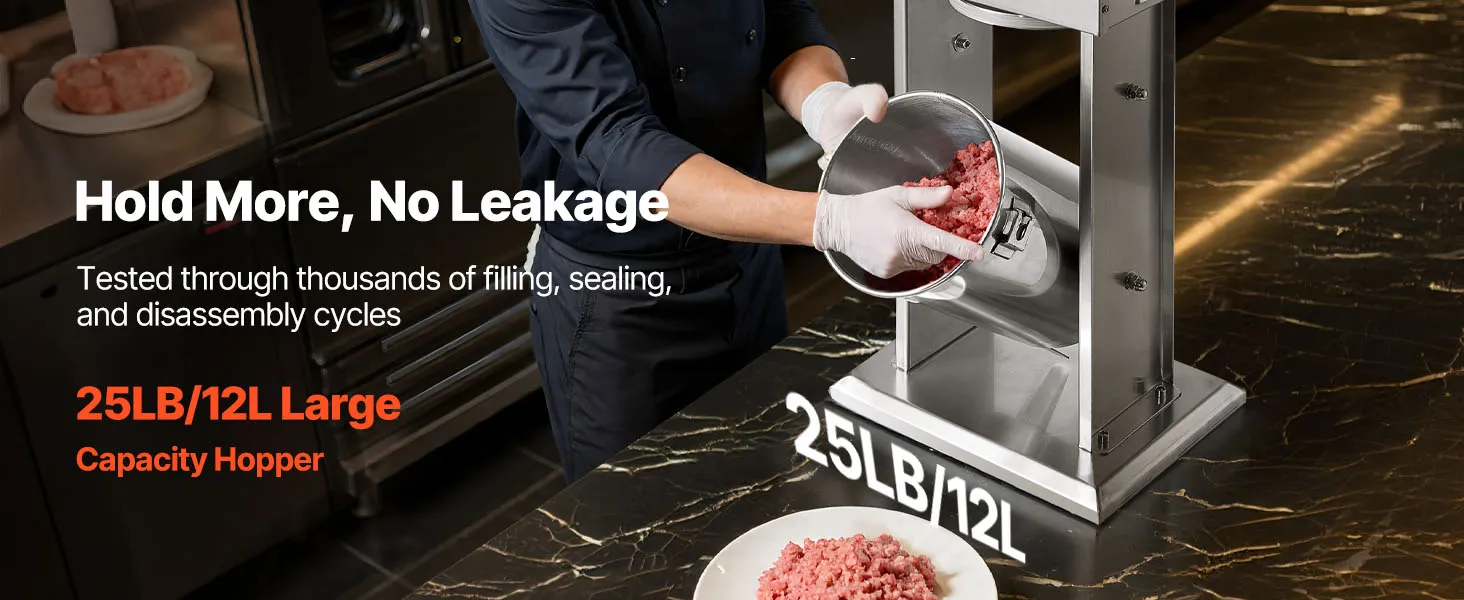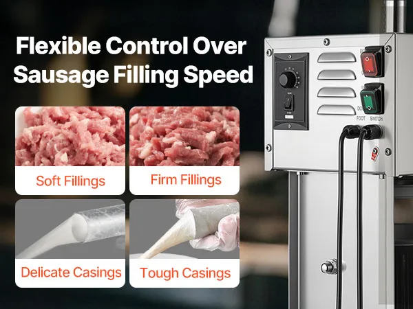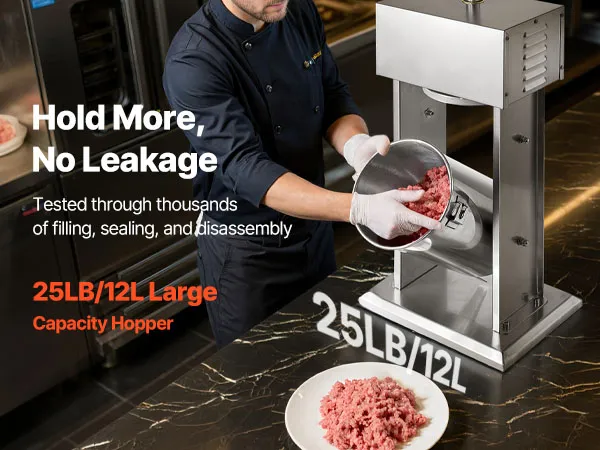 This electric sausage stuffer features an upgraded pressure plate with exhaust holes for firmer, low-bubble sausages. The stepless speed control improves efficiency, and its 25 lbs / 12 L large capacity is ideal for restaurants, supermarkets, and other commercial settings.