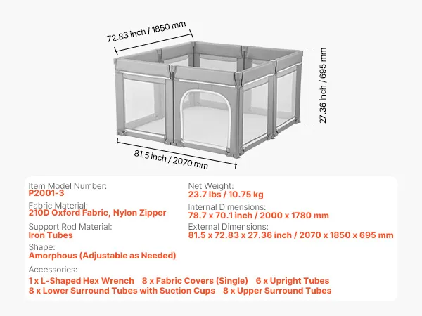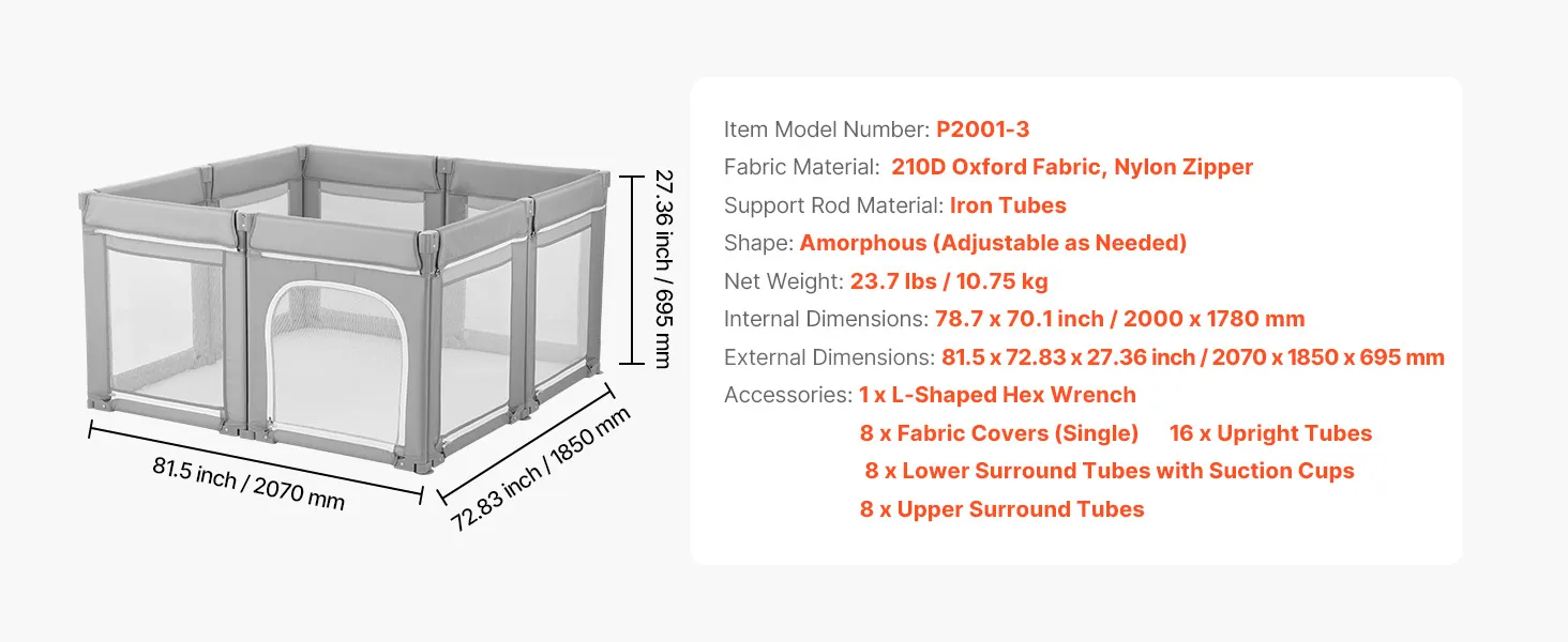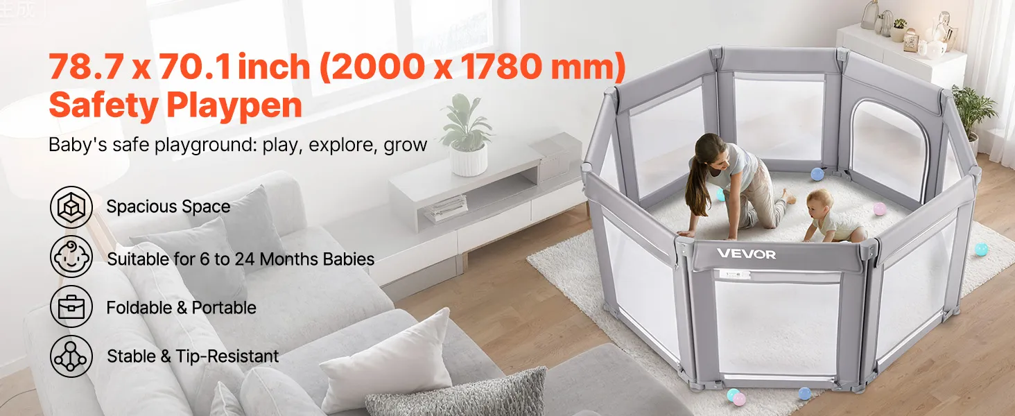 VEVOR 78.7 x 70.1 inch (2000 x 1780 mm) baby playpen blends safety and fun, creating a spacious and safe area for your little one. With quick setup and folding design, it's ideal for indoor and outdoor use — giving your baby room to play, explore, and grow, while you enjoy hands-free time.