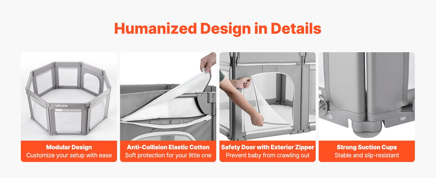 With soft elastic cotton, a safety door with exterior zipper, and strong suction cups, this indoor & outdoor toddlers playpen offers a secure and fun space for your baby to explore.