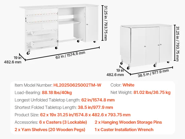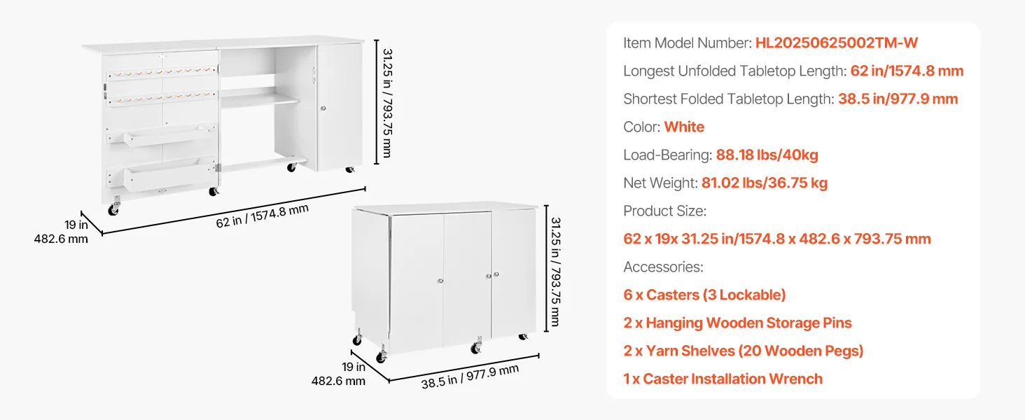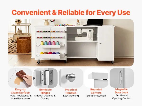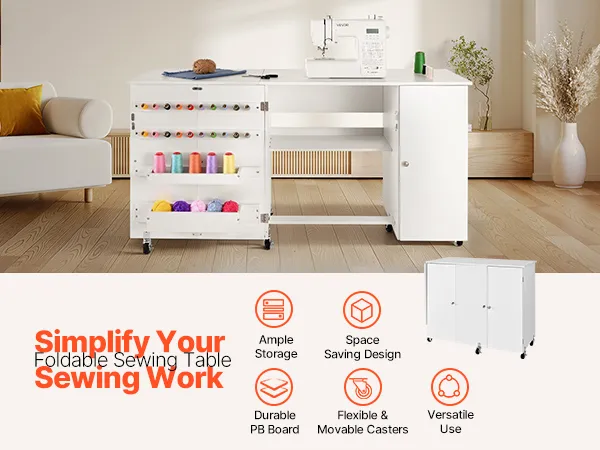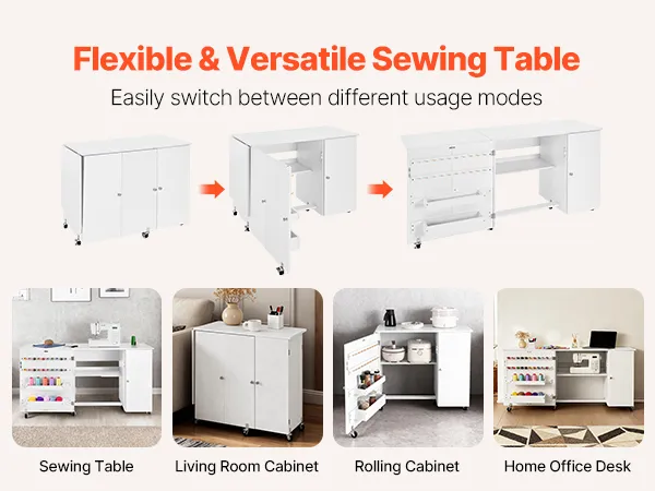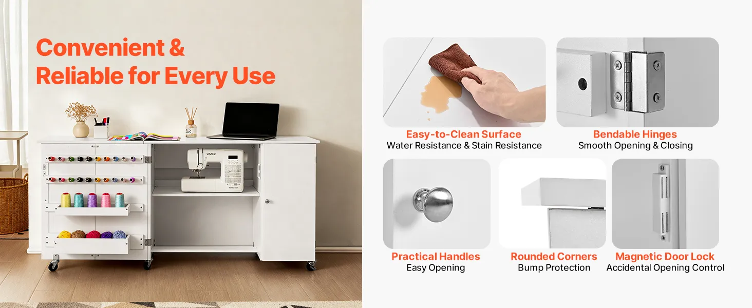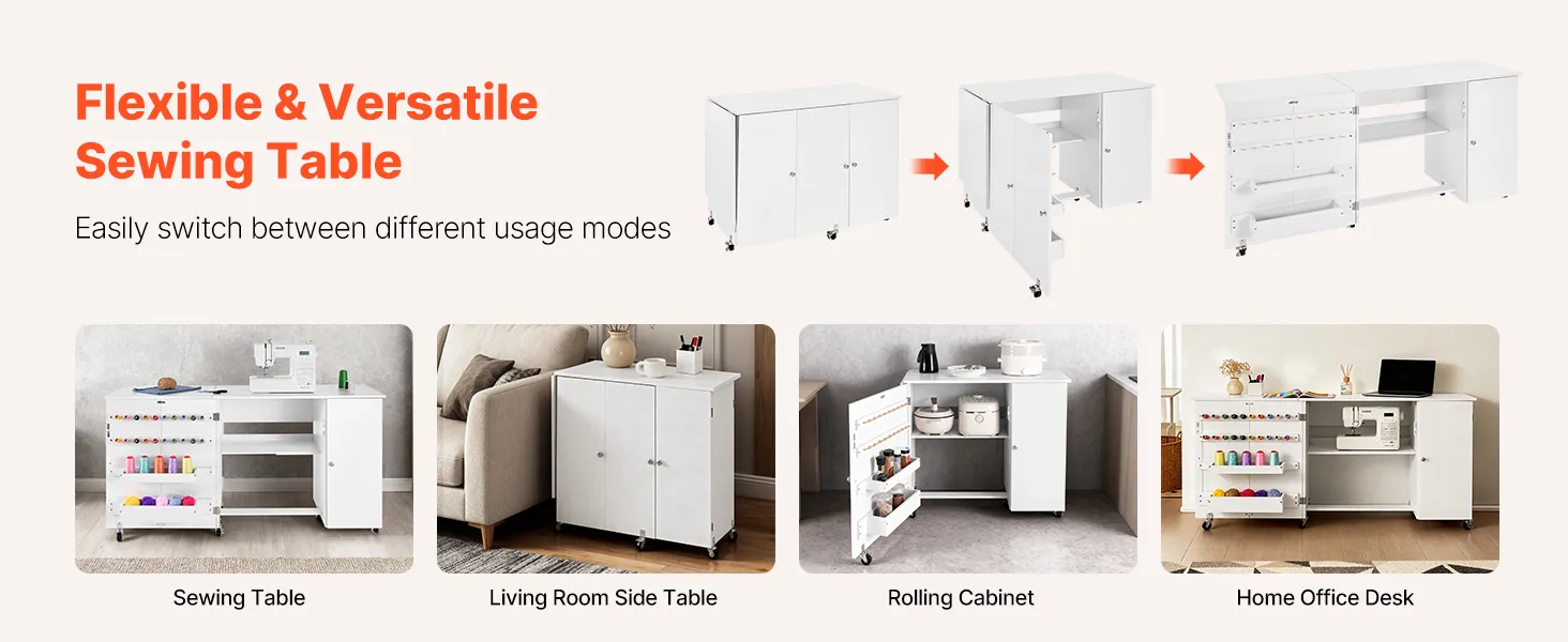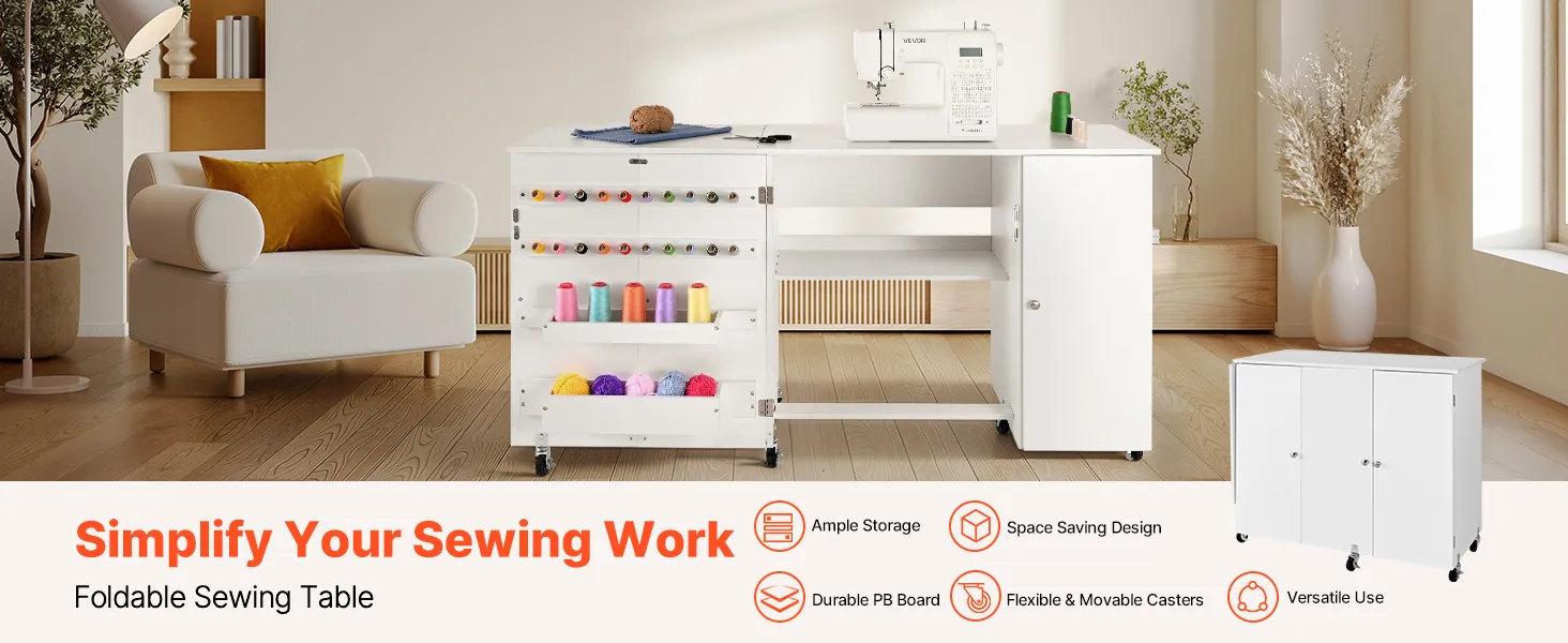• Foldable Design: Our sewing machine table features a flexible foldable design that provides a spacious working area when unfolded. When not in use, it folds into a compact side cabinet that takes up little space and fits in any corner for storage