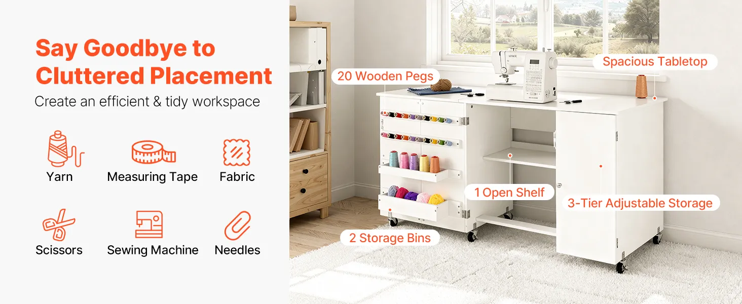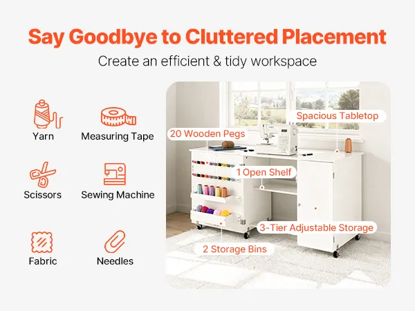 • Ample Storage Space: This sewing table has a 62 x 19 in work surface, 3-tier storage, 2 storage bins, 20 wooden pegs, and 1 open shelf. It can easily sort and store sewing tools and materials, keeping the work surface tidy, and smoothing your sewing