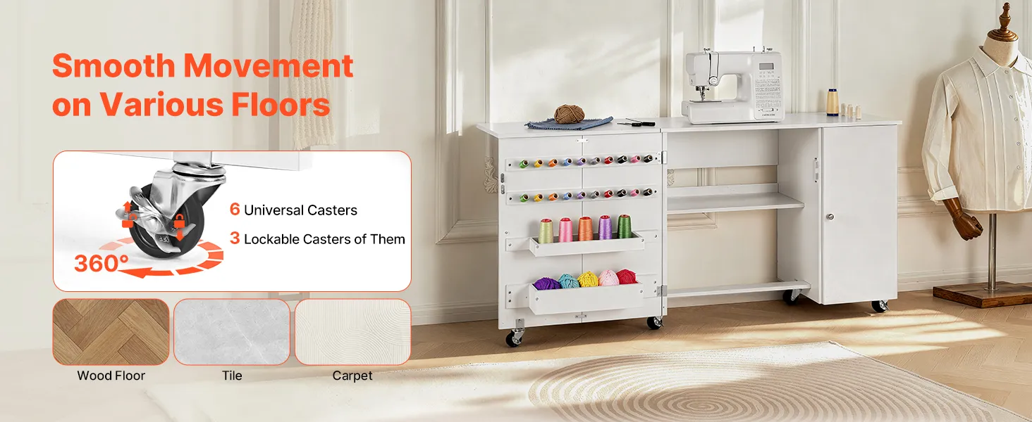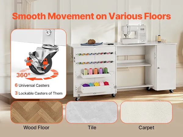 • Easy to Move: Equipped with 3 360° rotating casters and 3 locking casters, the sewing desk allows you to easily move the table anywhere. Its lockable casters keep it stable during use, while the 360° rotation enables flexible movement