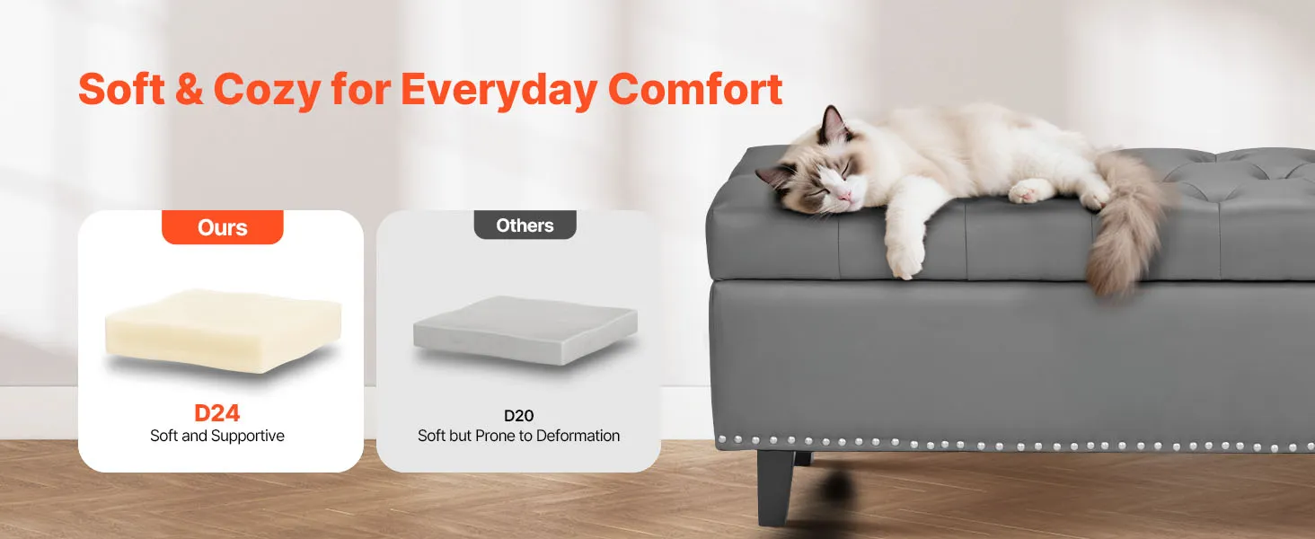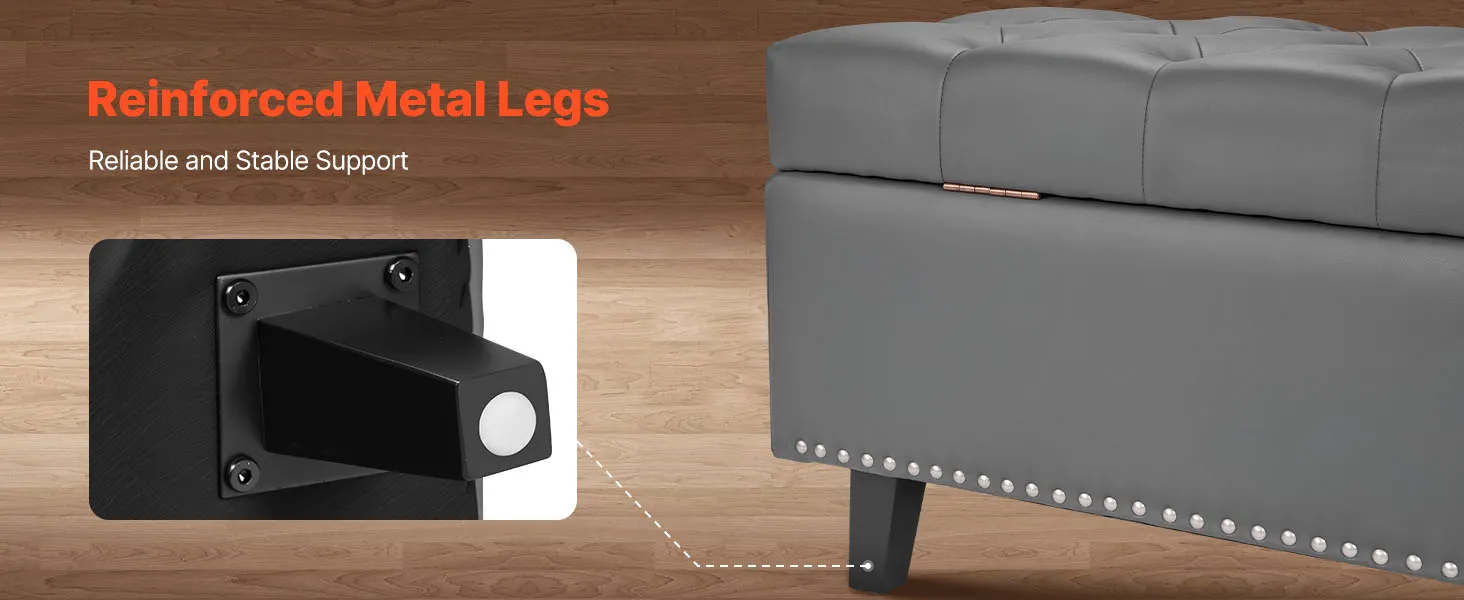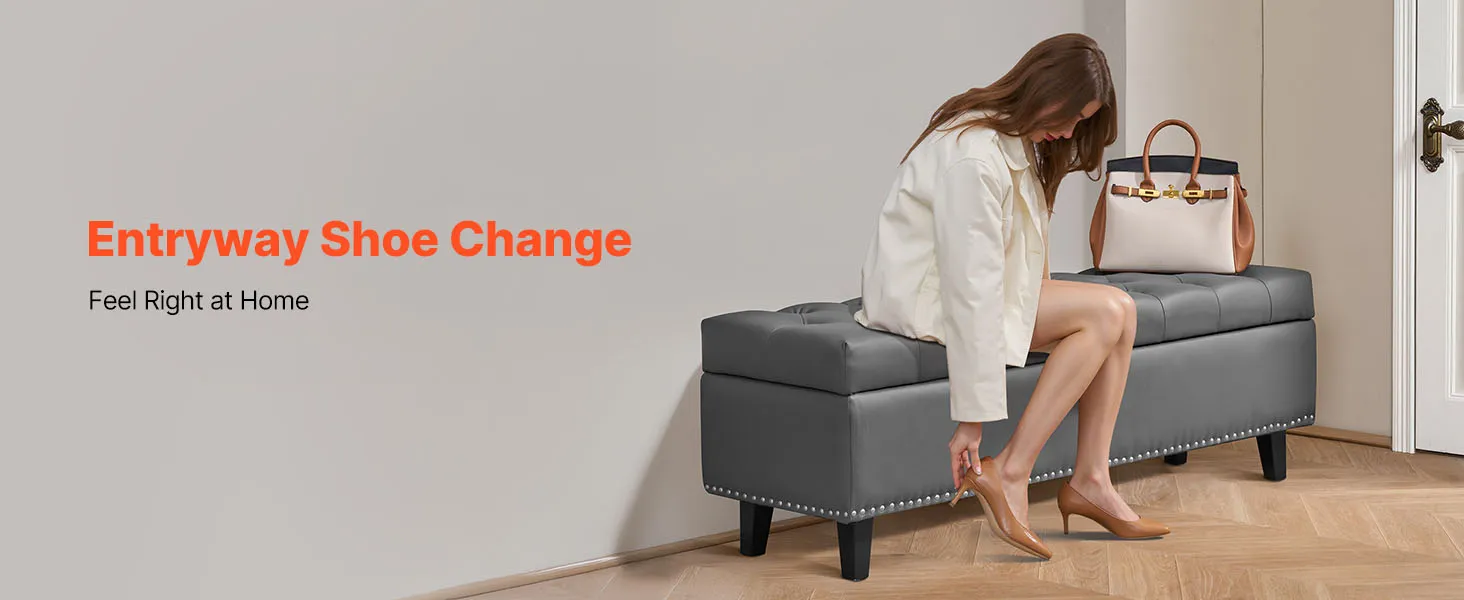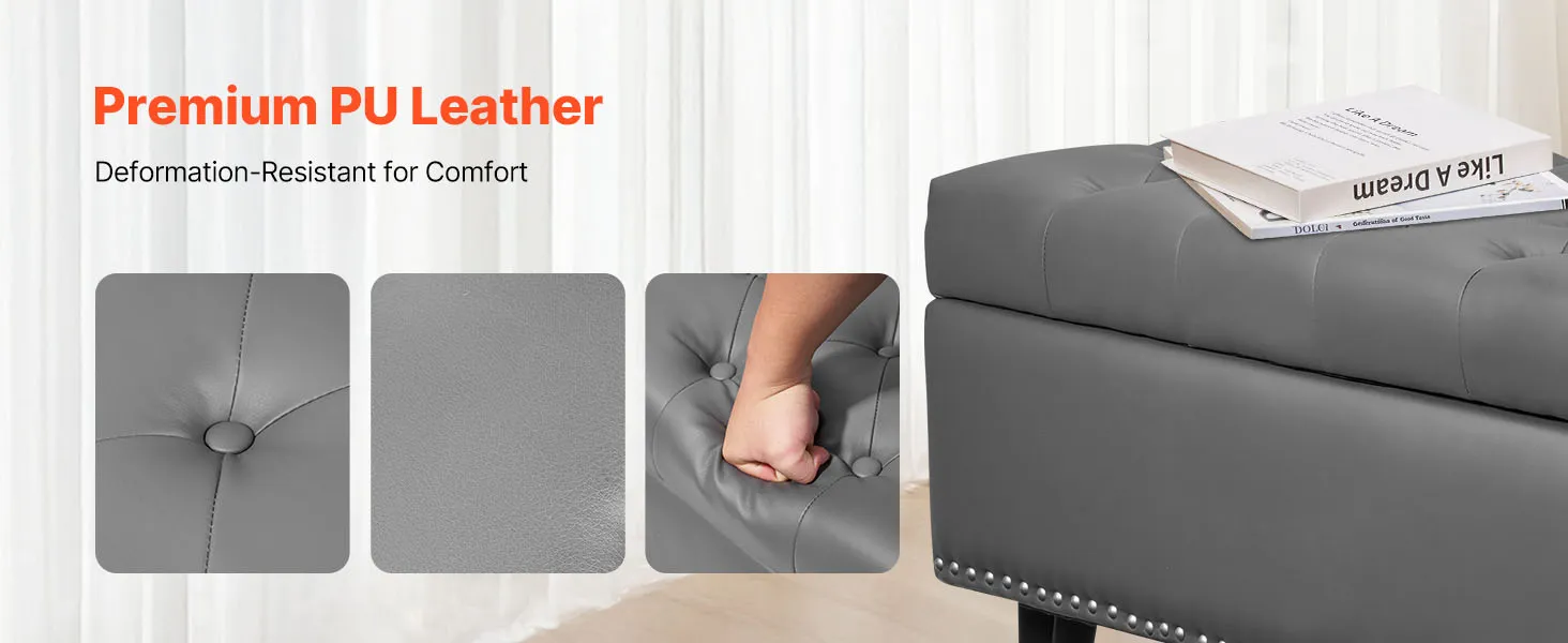VEVOR Button-Tufted Storage Ottoman Bench, PU Leather Bench with Storage and Solid Wood Legs, Modern Shoe Benches Seat for Entryway, Upholstered End of Bed Benches for Living Room, Dining Room, Gray
