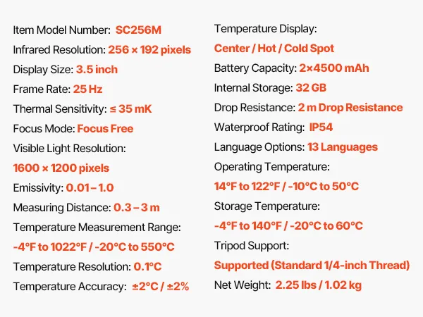 • Long-Lasting & Durable: Powered by 2 pieces of 4500mAh batteries, our thermal camera ensures extended runtime. With 32GB built-in storage, it saves over 120,000 images, supporting both photo and video recording. WiFi transfer and 13-language operation add convenience. Its lightweight, rugged design withstands 2m drops and meets IP54 water resistance, adapting to various environments