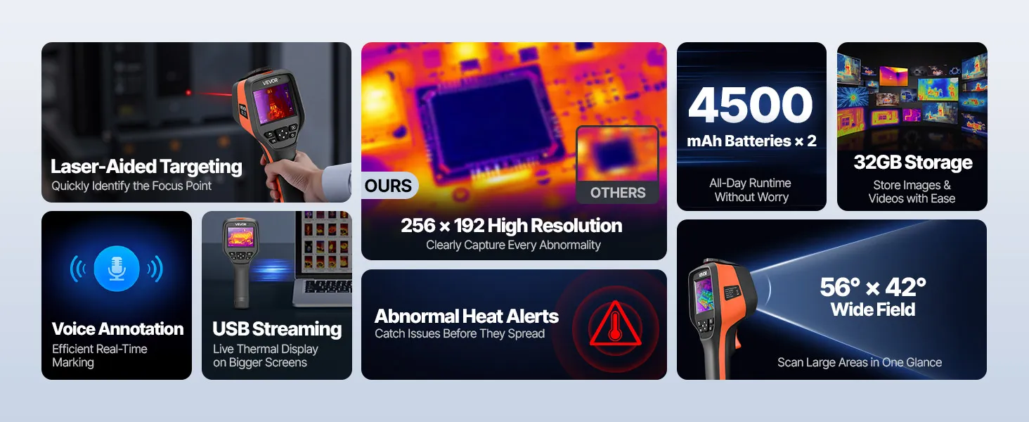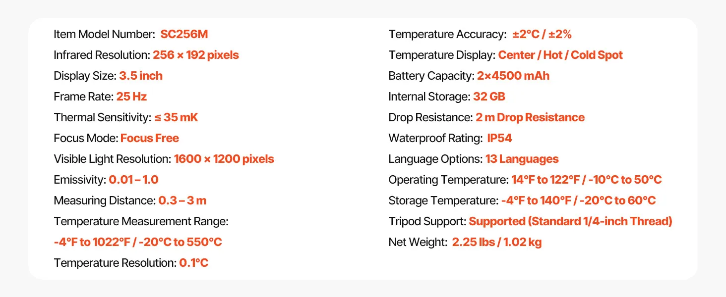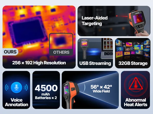 • High-Resolution Thermal Imager: Our handheld thermal imager is equipped with a 2MP visible light camera and 256 x 192 IR resolution, delivering sharper images to detect subtle heat variations. With a 56° x 42° FOV, 25Hz refresh rate, ≤35 mK thermal sensitivity, image sharpening algorithms, and an advanced AI chip, it captures heat details with exceptional clarity