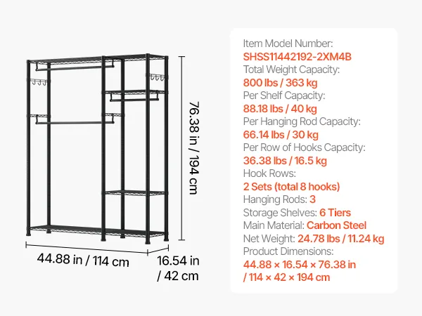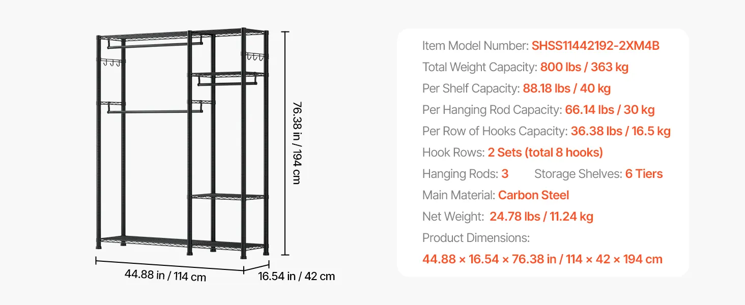 Made of thickened carbon steel for strength and durability, with a powder-coated finish that resists rust and corrosion. The robust design ensures that each shelf, hanging rod, and hook can easily handle the weight of everyday clothing and items, providing reliable support and peace of mind.