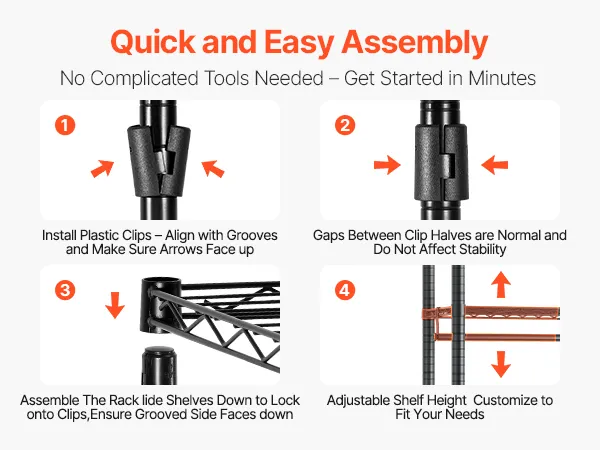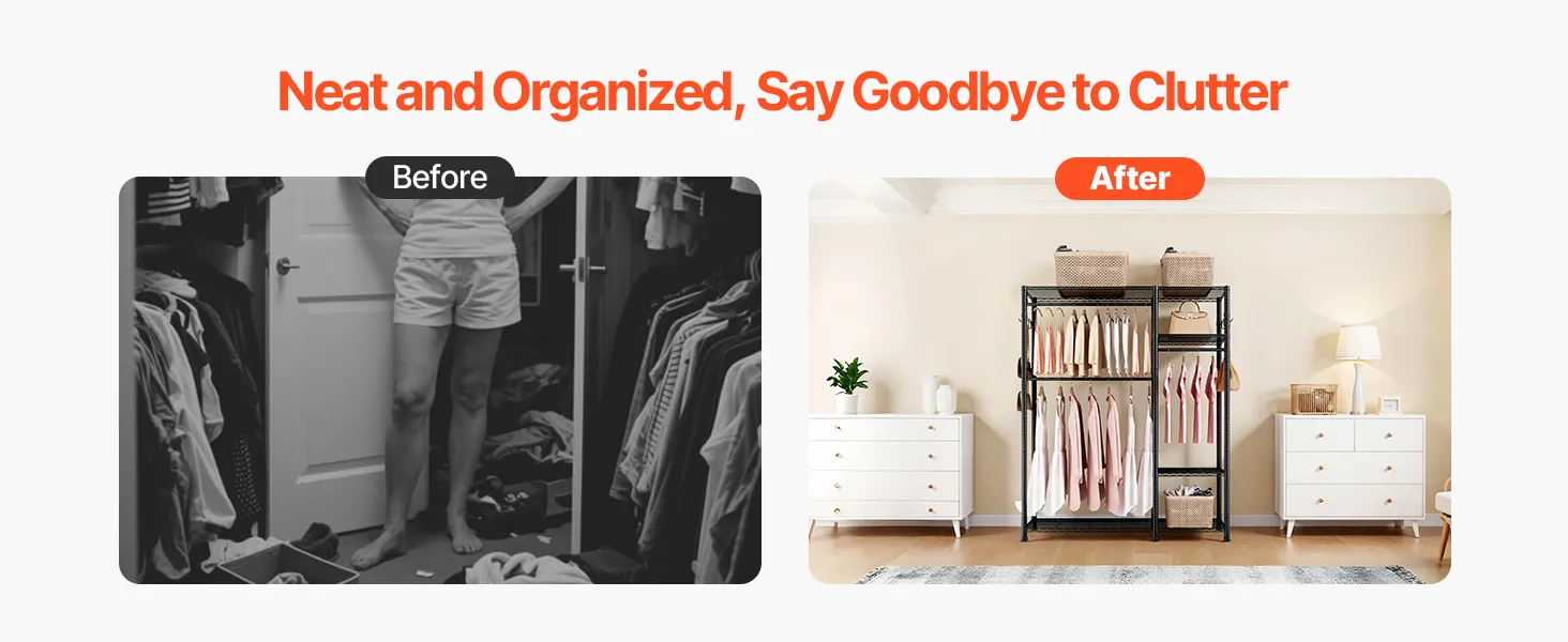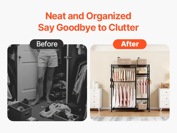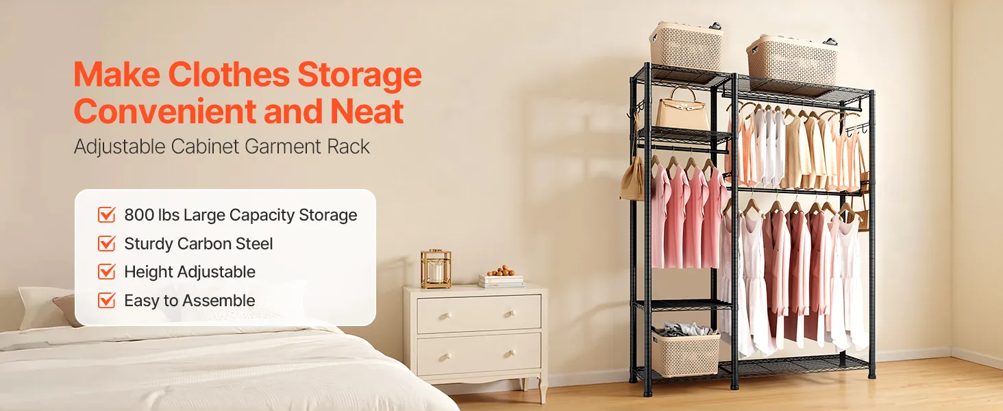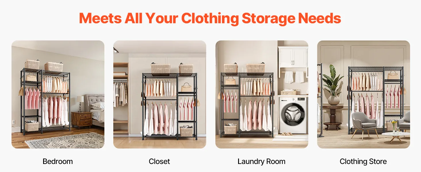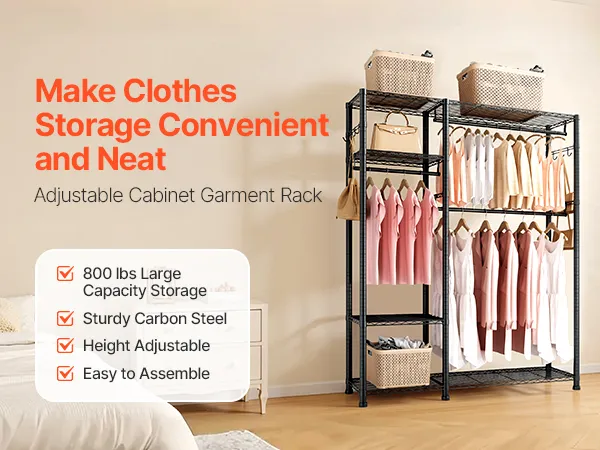 This clothing garment rack provides ample storage and is made of heavy-duty carbon steel for durability. Shelves are height-adjustable to fit clothing of different sizes, offering flexible storage. Quick and tool-free assembly makes organizing your space easy and efficient.