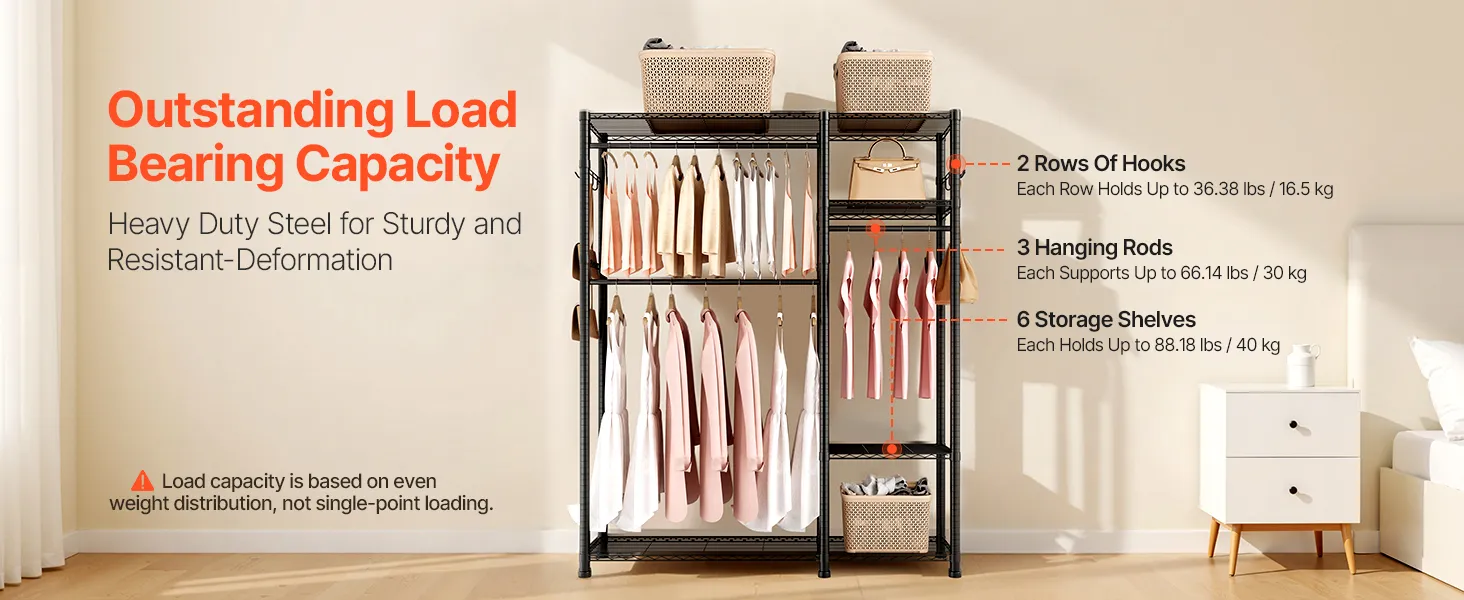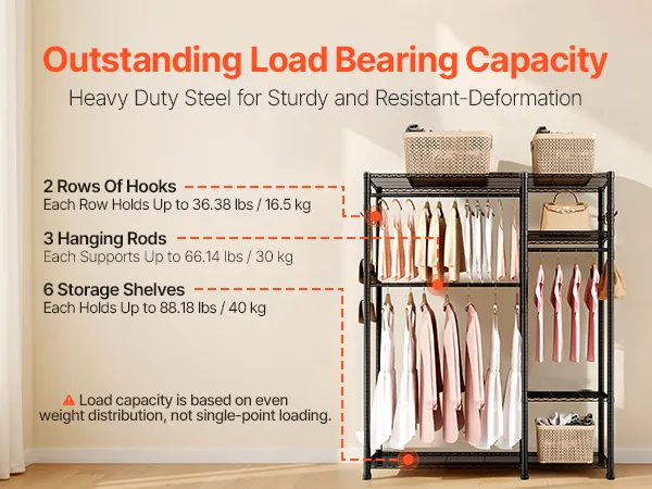VEVOR Clothing Garment Rack, Heavy Duty Clothes Rack, 6 Adjustable Tiers Clothes Racks with Steel Frame, 363 kg Load Capacity Closet Wardrobe with 3 Hanging Rods for Bedroom, Clothing Store, Hallway