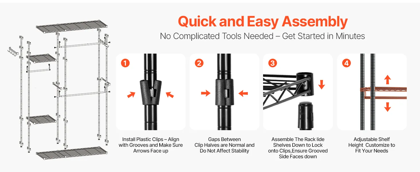 Designed for user convenience, this hanging clothes rack can be quickly and easily assembled without tools or special skills. Plastic clips and slide-in connectors ensure a secure setup in just a few simple steps, letting you enjoy efficient storage right away.