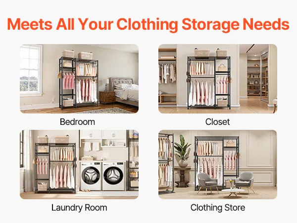With a sleek and classic black finish, this heavy duty clothes rack fits effortlessly into any setting. Ideal for bedrooms, walk-in closets, laundry rooms, or retail stores, it adds elegance while meeting diverse storage needs.