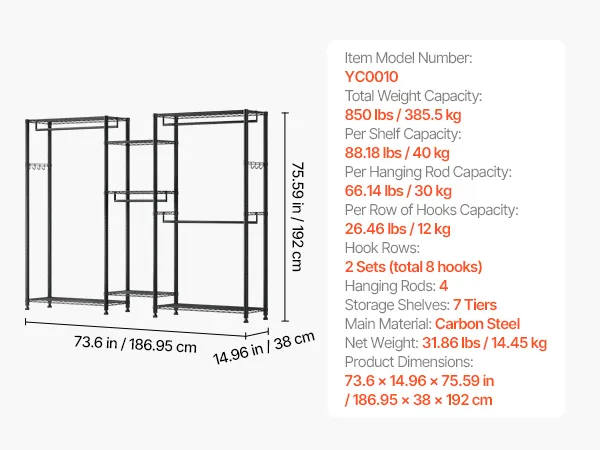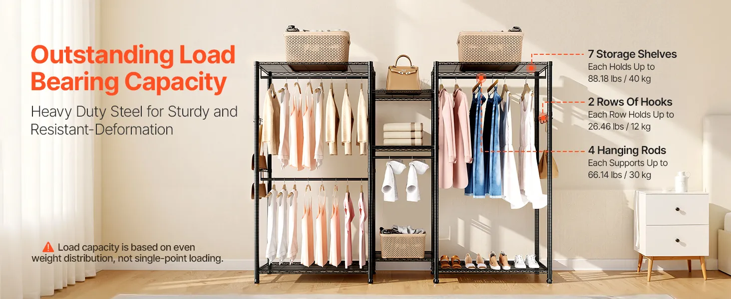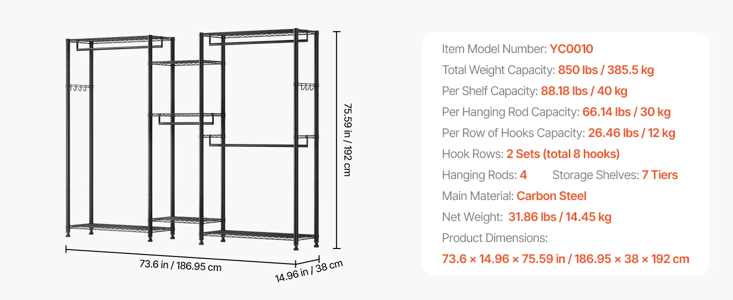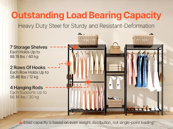 Made of thickened carbon steel for strength and durability, with a powder-coated finish that resists rust and corrosion. The robust design ensures that each shelf, hanging rod, and hook can easily handle the weight of everyday clothing and items, providing reliable support and peace of mind.