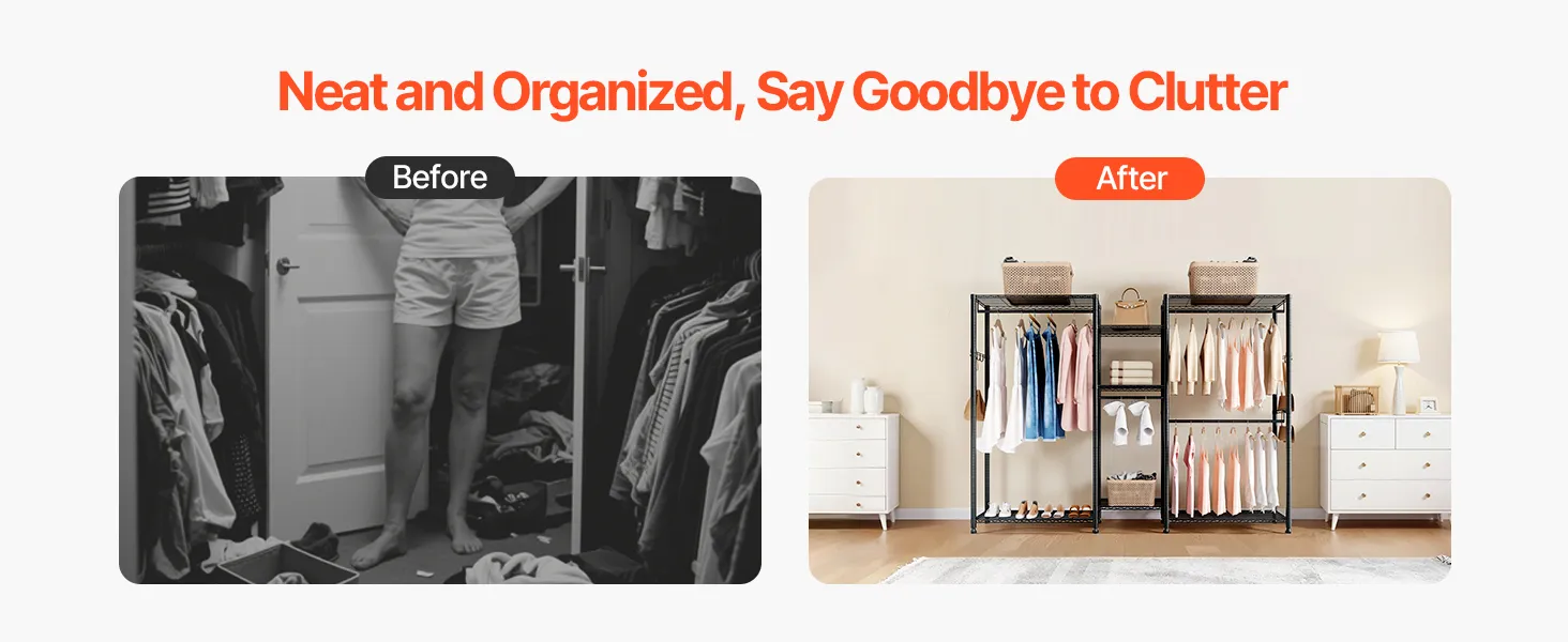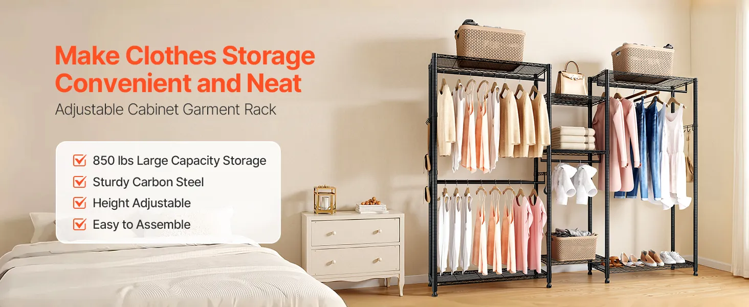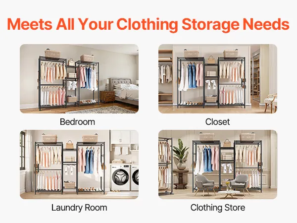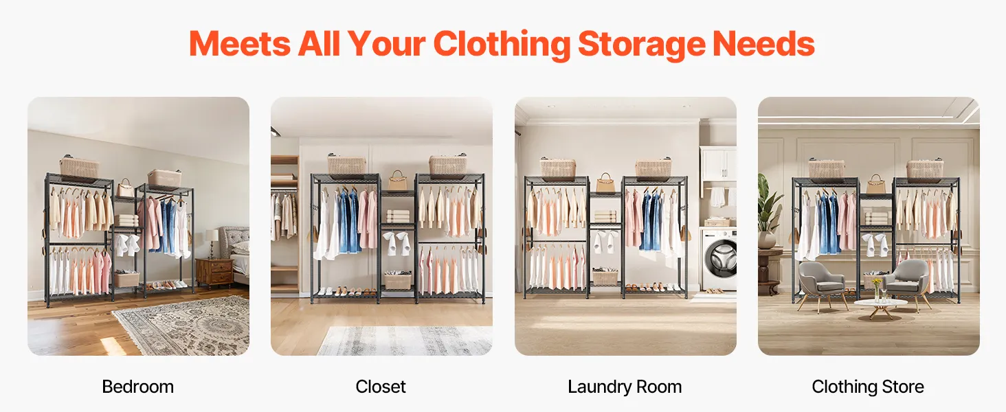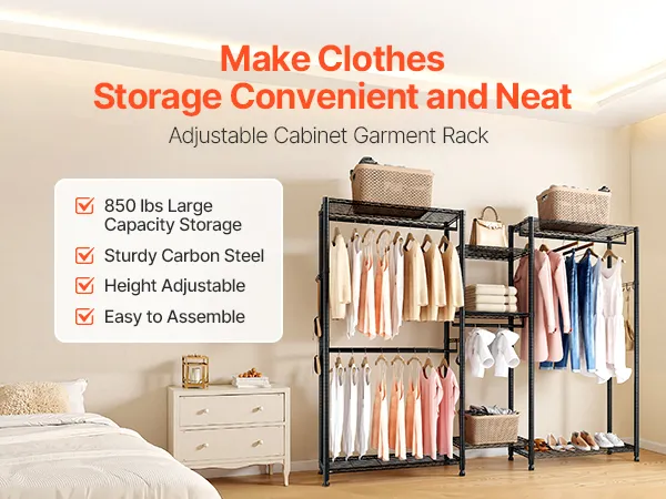 This clothing garment rack provides ample storage and is made of heavy-duty carbon steel for durability. Shelves are height-adjustable to fit clothing of different sizes, offering flexible storage. Quick and tool-free assembly makes organizing your space easy and efficient.