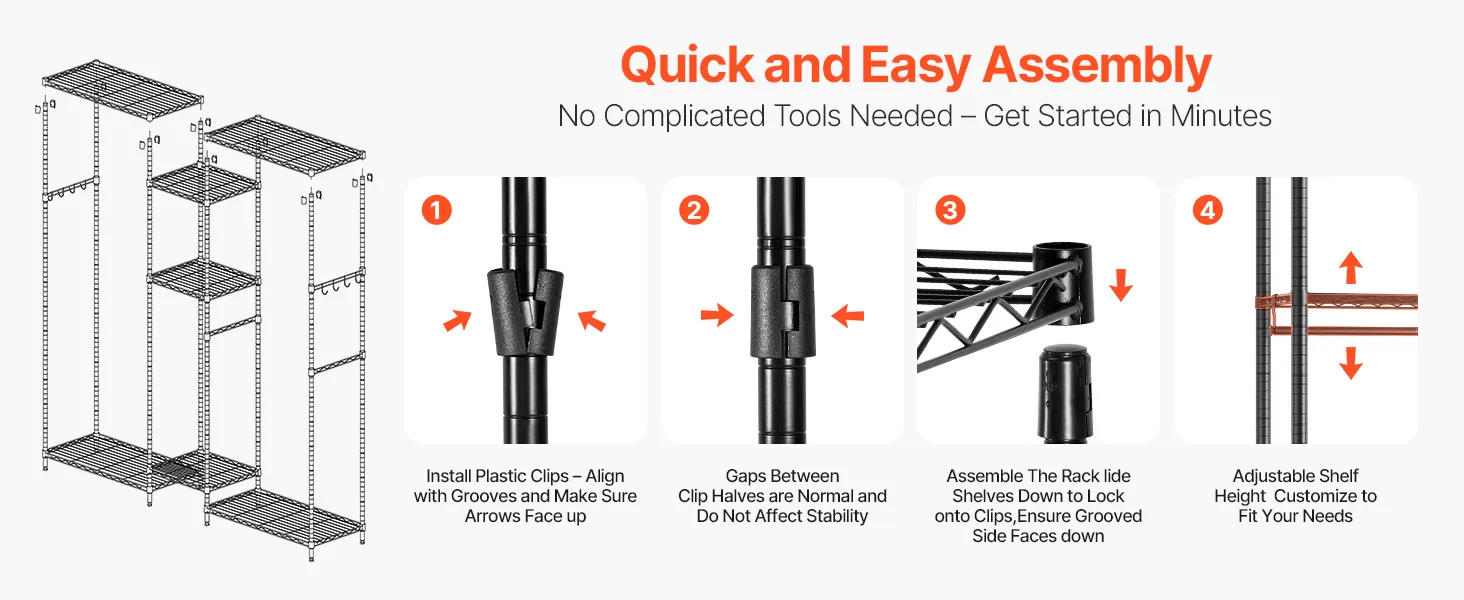 Designed for user convenience, this hanging clothes rack can be quickly and easily assembled without tools or special skills. Plastic clips and slide-in connectors ensure a secure setup in just a few simple steps, letting you enjoy efficient storage right away.