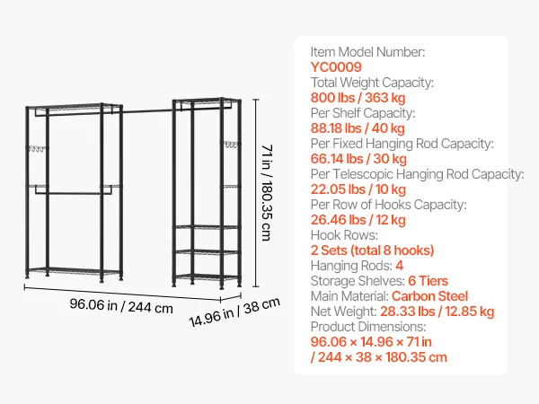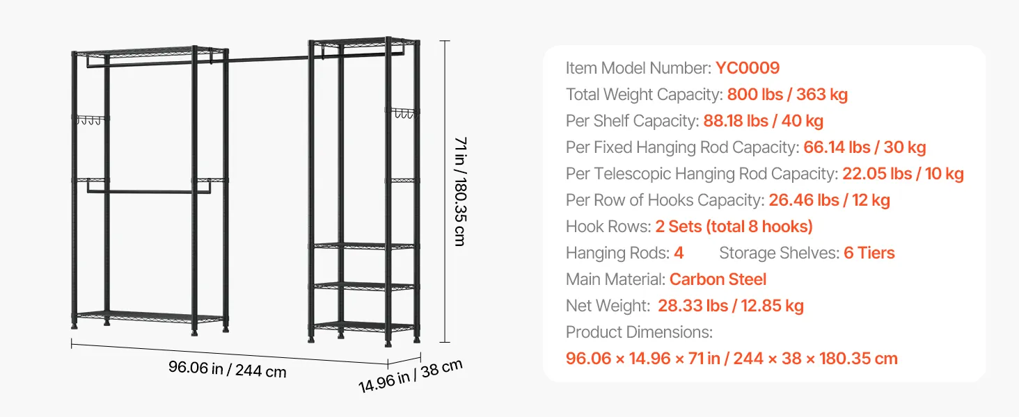 Made of thickened carbon steel for strength and durability, with a powder-coated finish that resists rust and corrosion. The robust design ensures that each shelf, hanging rod, and hook can easily handle the weight of everyday clothing and items, providing reliable support and peace of mind.
