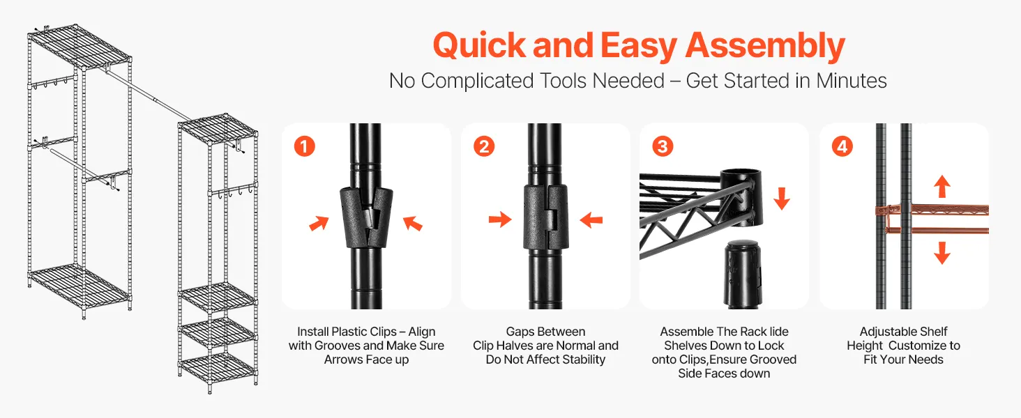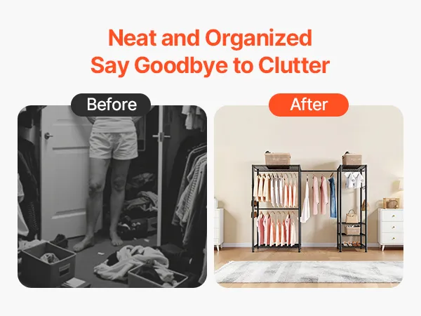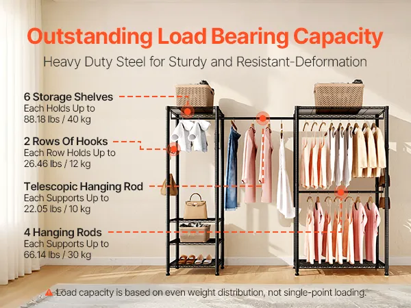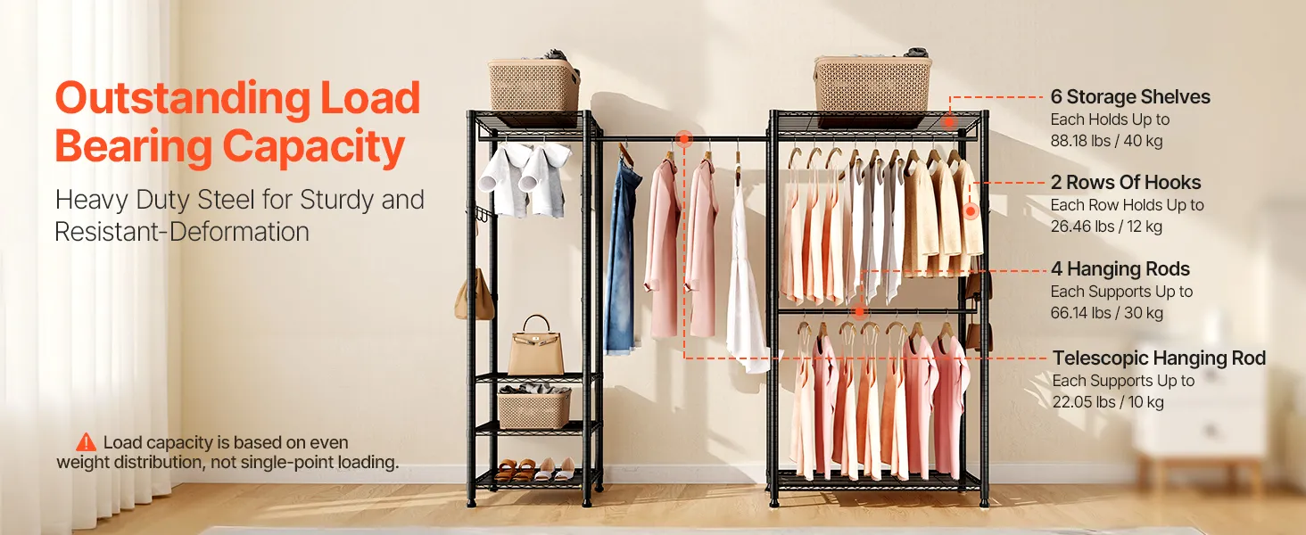 This clothing garment rack provides ample storage and is made of heavy-duty carbon steel for durability. Both shelves and hanging rods are adjustable, easily accommodating clothing of various sizes for personalized storage. Quick and tool-free assembly ensures a convenient and efficient setup.