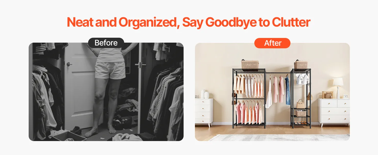 This clothes rack keeps clothes neatly arranged, maximizes indoor space, and makes it easy to find what you need. Ideal for daily wear or seasonal items, it helps maintain a tidy, attractive home while providing a comfortable and convenient storage experience.