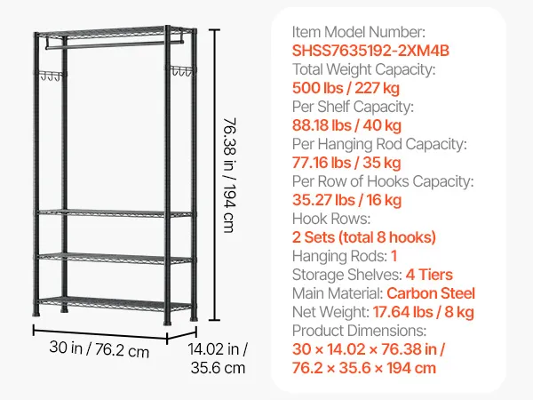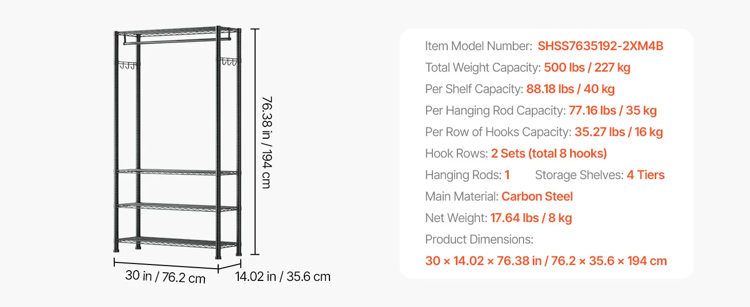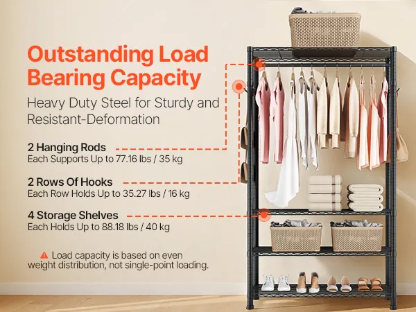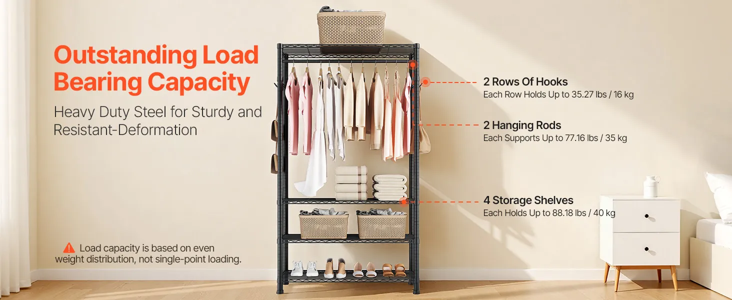 Made of thickened carbon steel for strength and durability, with a powder-coated finish that resists rust and corrosion. The robust design ensures that each shelf, hanging rod, and hook can easily handle the weight of everyday clothing and items, providing reliable support and peace of mind.