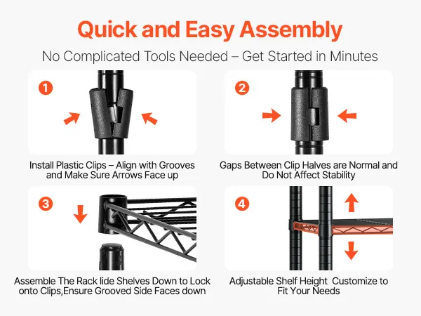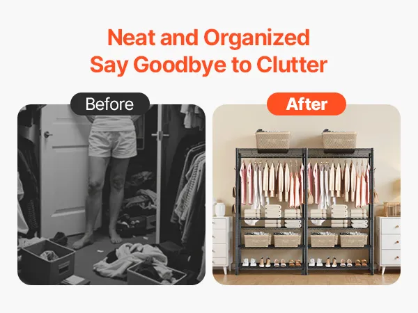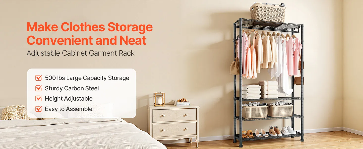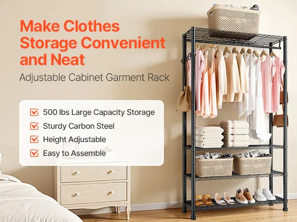 This clothing garment rack provides ample storage and is made of heavy-duty carbon steel for durability. Shelves are height-adjustable to fit clothing of different sizes, offering flexible storage. Quick and tool-free assembly makes organizing your space easy and efficient.