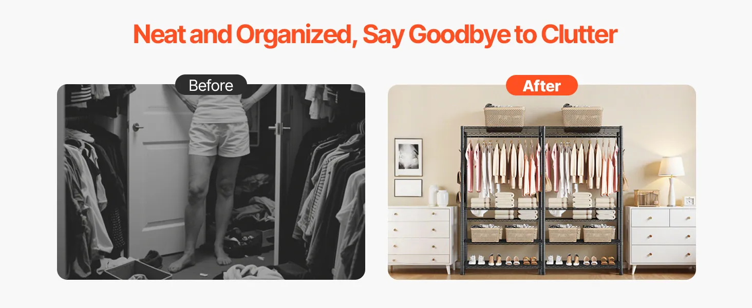 This clothes rack keeps clothes neatly arranged, maximizes indoor space, and makes it easy to find what you need. Ideal for daily wear or seasonal items, it helps maintain a tidy, attractive home while providing a comfortable and convenient storage experience.