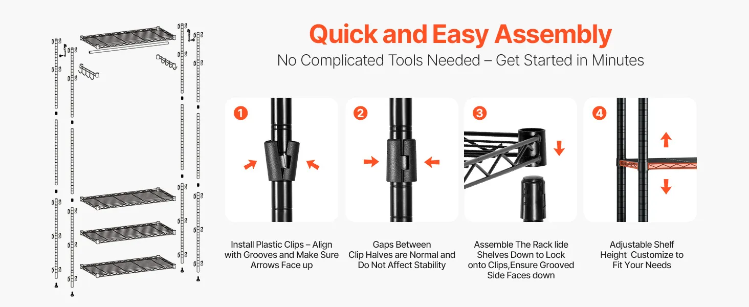 Designed for user convenience, this hanging clothes rack can be quickly and easily assembled without tools or special skills. Plastic clips and slide-in connectors ensure a secure setup in just a few simple steps, letting you enjoy efficient storage right away.