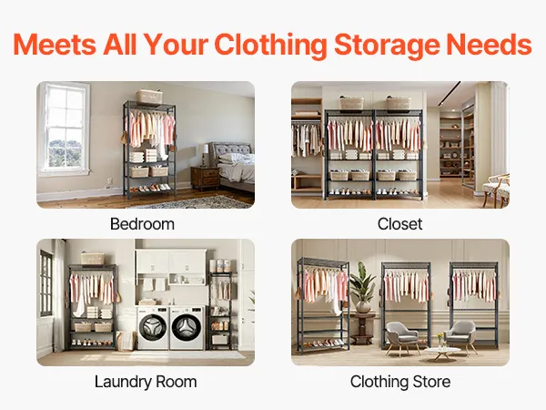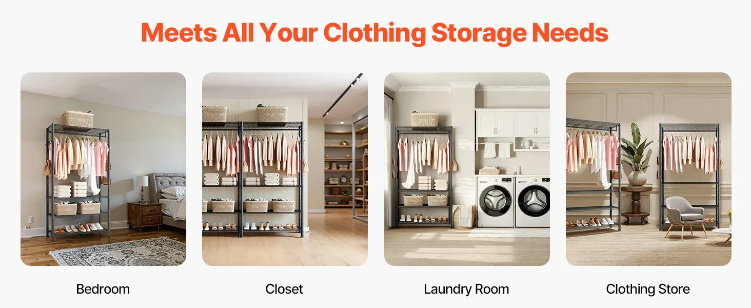 With a sleek and classic black finish, this heavy duty clothes rack fits effortlessly into any setting. Ideal for bedrooms, walk-in closets, laundry rooms, or retail stores, it adds elegance while meeting diverse storage needs.