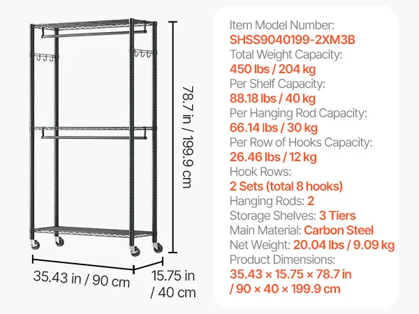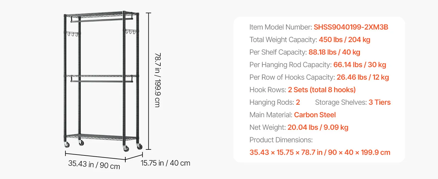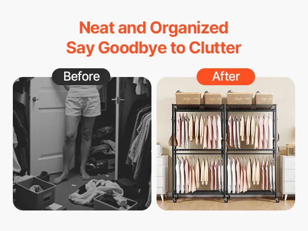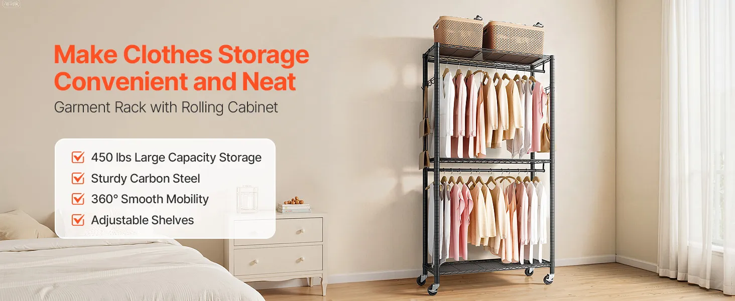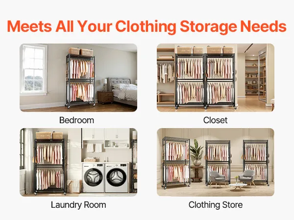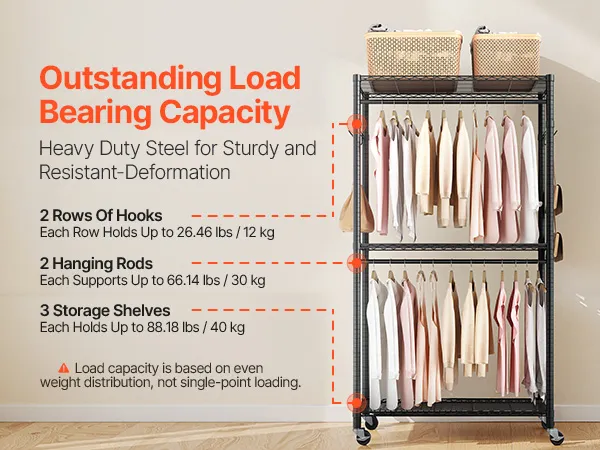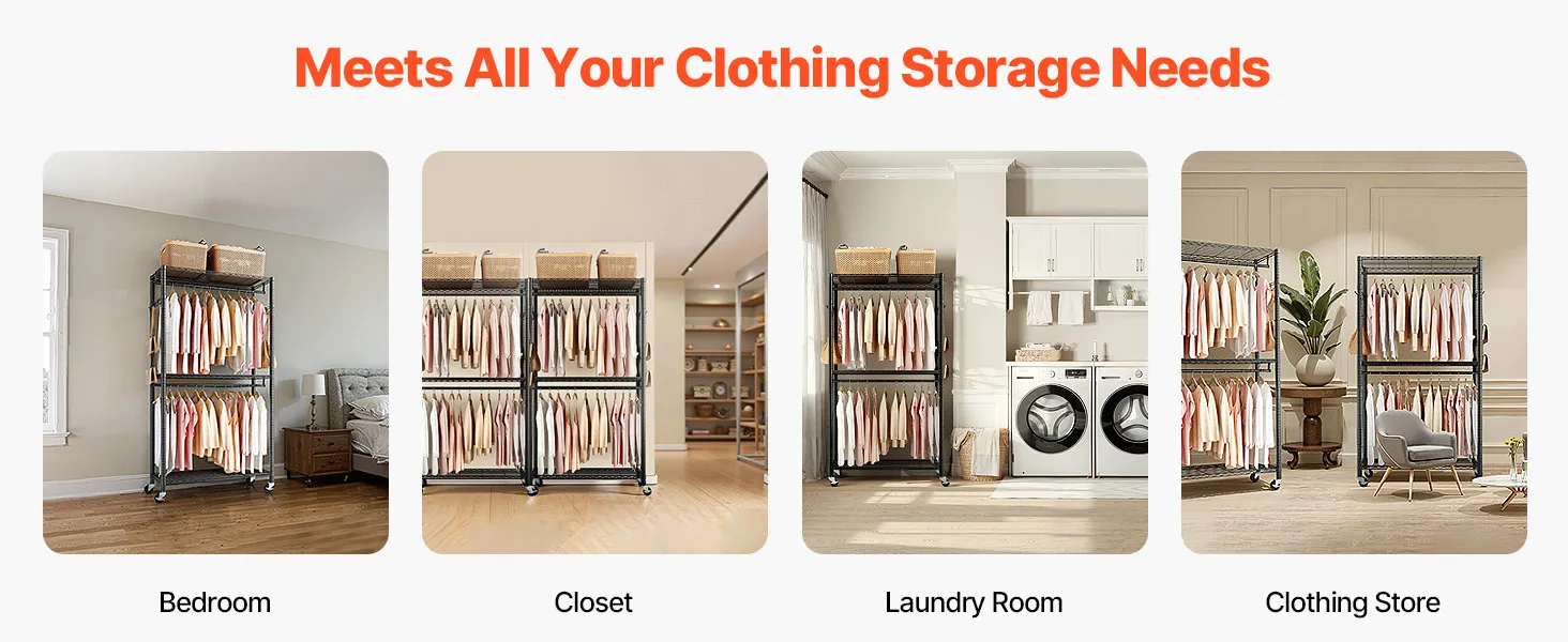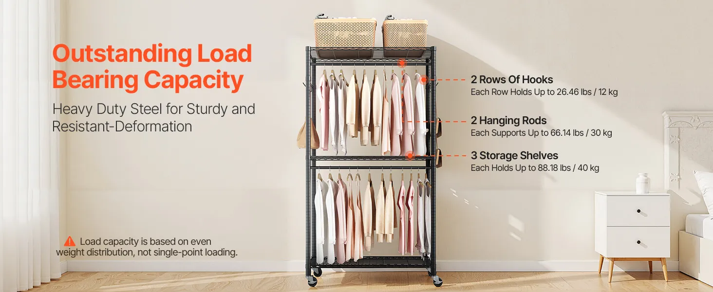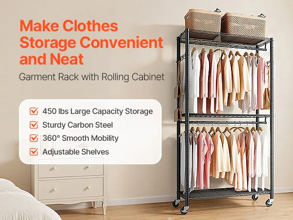 This rolling clothes rack provides ample storage space and is built from heavy-duty carbon steel for strength and durability. 360° wheels allow easy mobility. Adjustable shelves accommodate clothing and items of various sizes, making storage effortless and convenient.