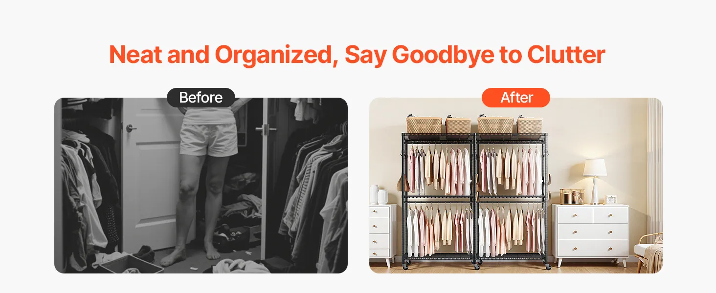 This clothes rack keeps clothes neatly arranged, maximizes indoor space, and makes it easy to find what you need. Ideal for daily wear or seasonal items, it helps maintain a tidy, attractive home while providing a comfortable and convenient storage experience.