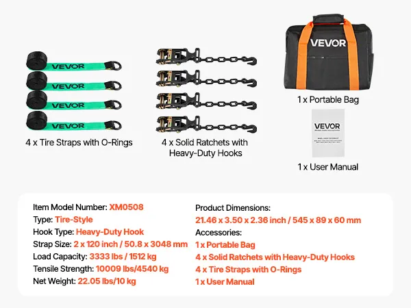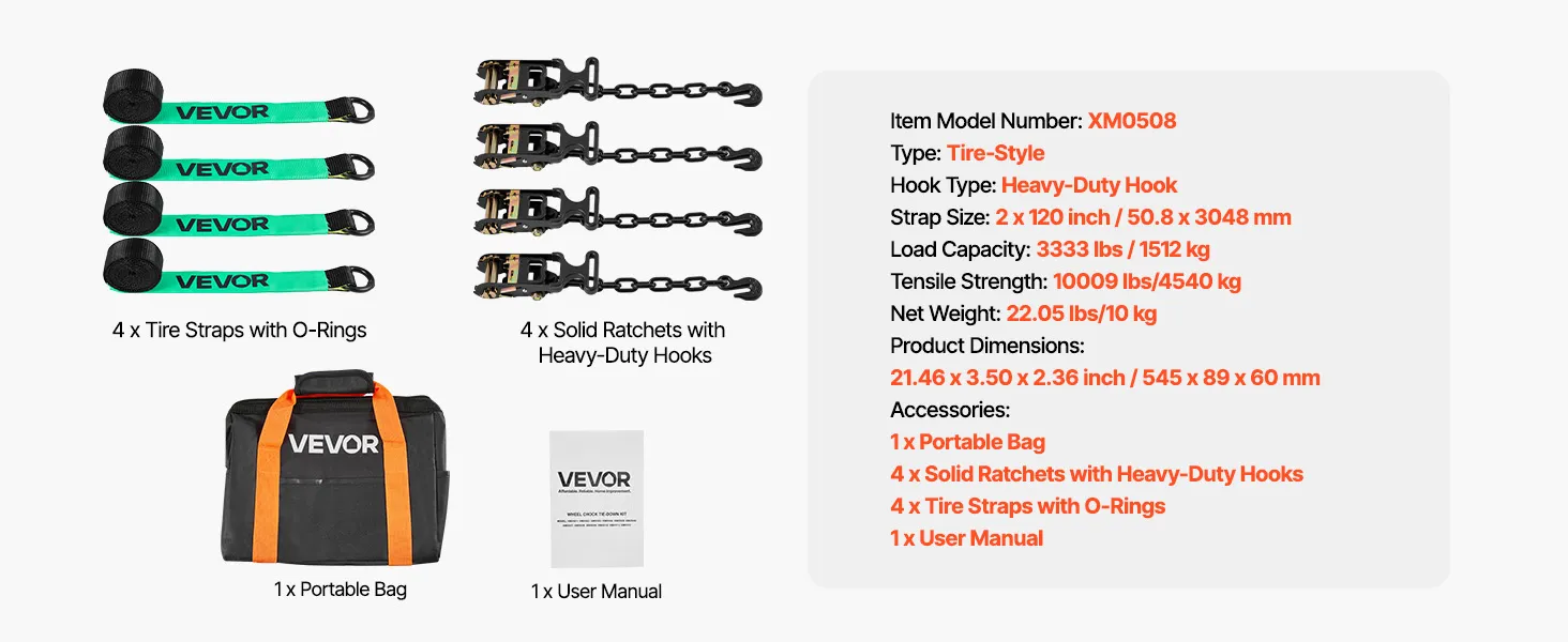 VEVOR Wheel Chock Tie-Down Kit, Tire-Style Tow Dolly Strap, Car Tie Down Kit with Heavy-Duty Hook, Break Strength 4540 kg & Working Load 1512 kg Motorcycle Tie-Down System for ATV, SUV, Trailer