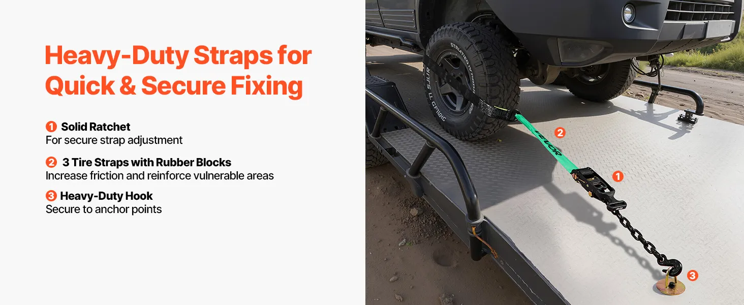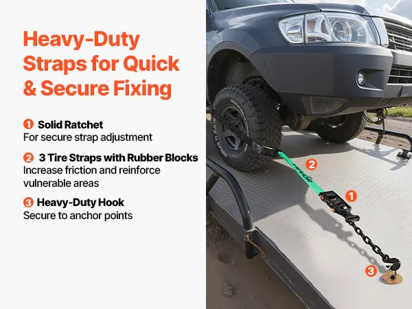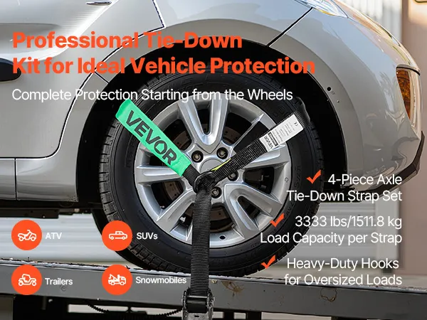 Equipped with a heavy-duty hook, our wheel tie-down kit provides reliable load support for heavy vehicle transport. Made from polyester, each strap supports up to 3333 lbs/1512 kg, keeping your vehicle in place while being transported or parked.