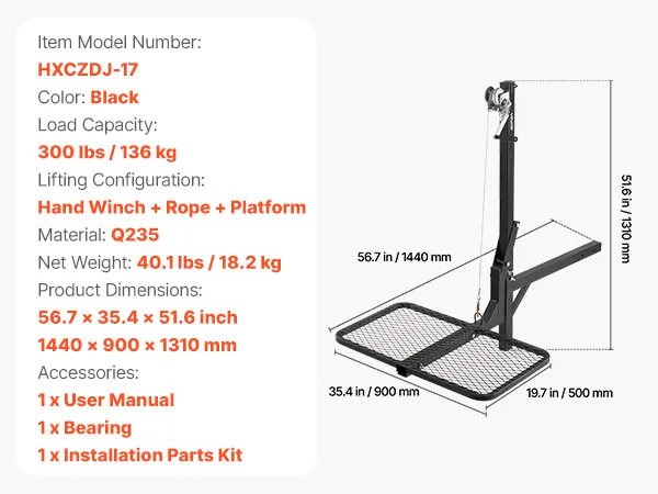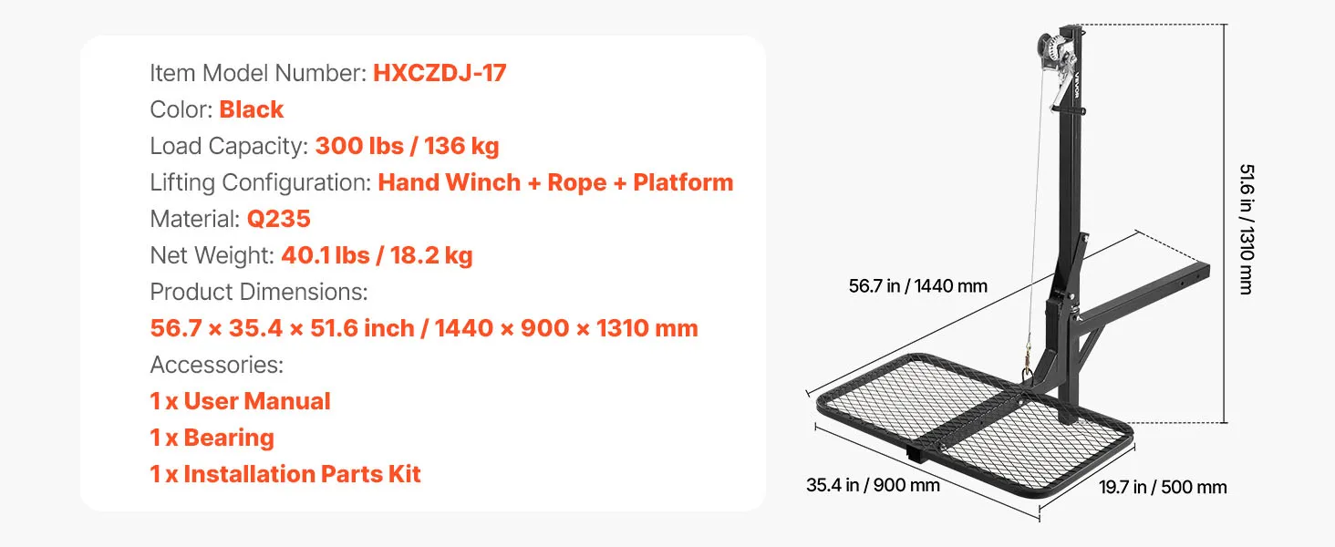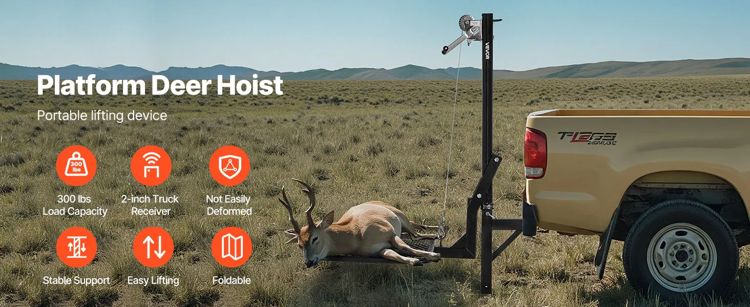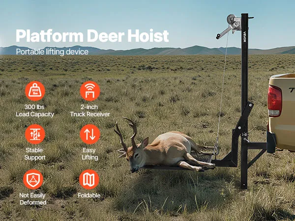 VEVOR Hitch Deer Hoist with Lifting System Platform, 300 lbs Load Capacity, Game Hoist Winch Lift with 2-inch Receiver, 360-Degree Swivel Shaft & Foldable, Hitch-Mounted Deer Hanger for Moving Game