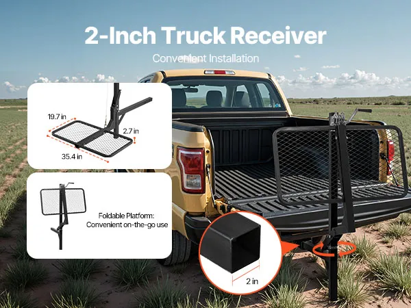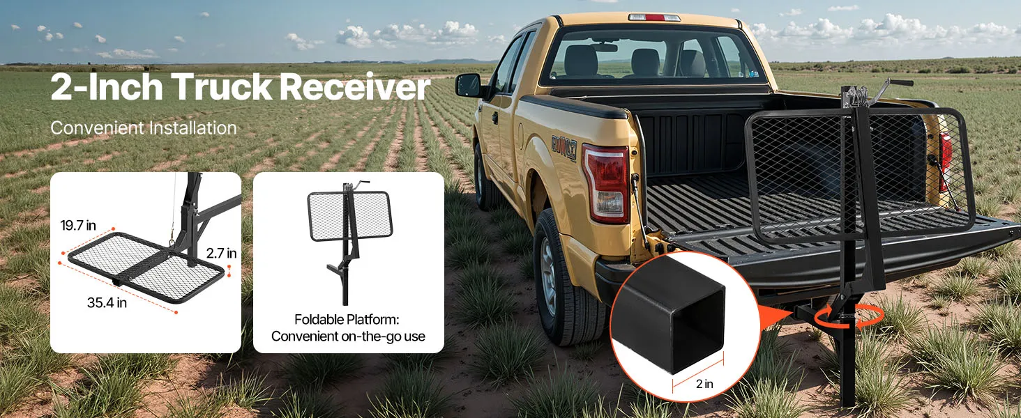 Our truck hitch game hoist is equipped with a 2-inch truck receiver, compatible with most trucks on the market. The storage platform can be folded away when not in use, eliminating the need for complete disassembly and reinstallation.