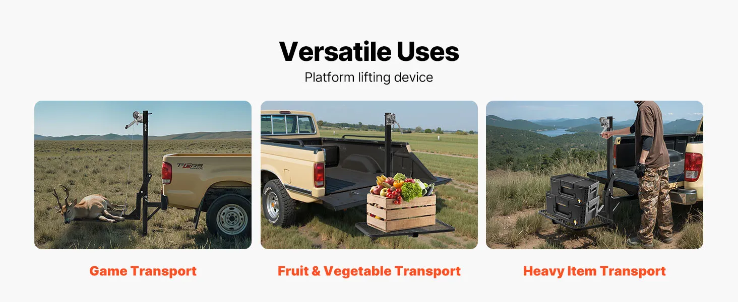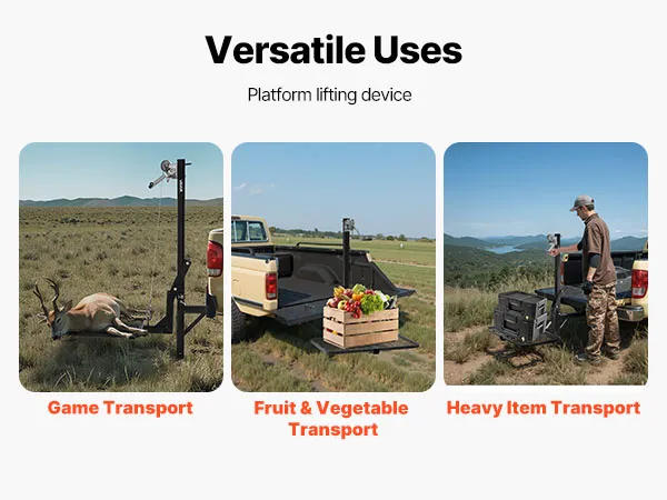 Our hitch-mounted lifting system is ideal for transporting game after outdoor hunting, farm animal and vegetable transport, or lifting heavy materials and equipment outdoors.