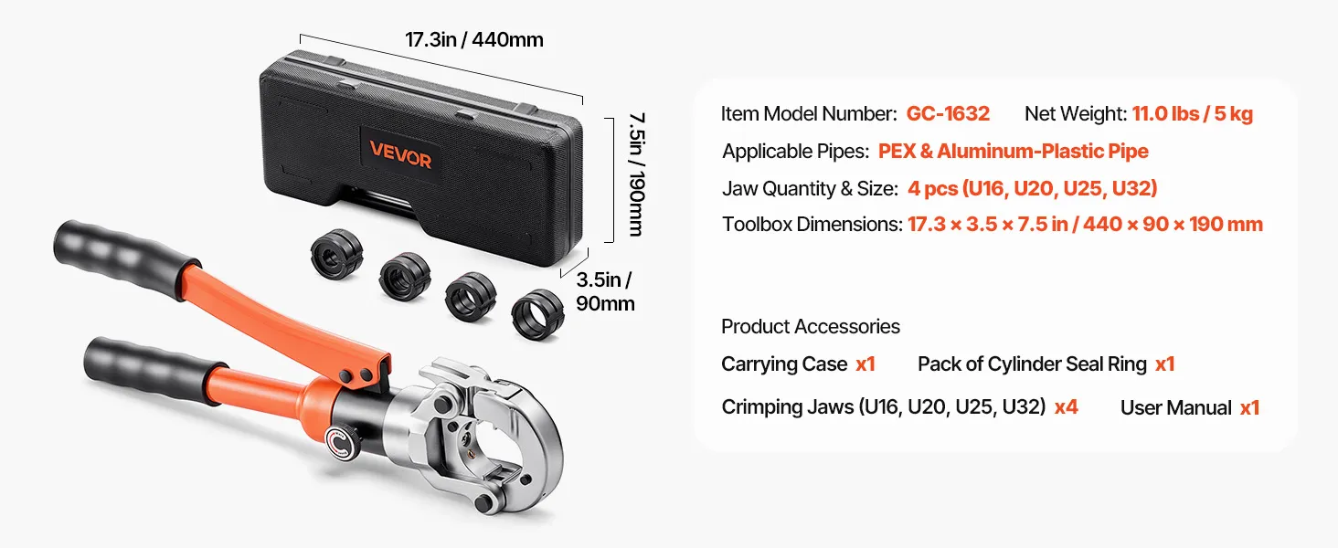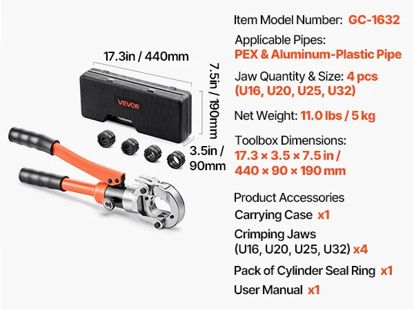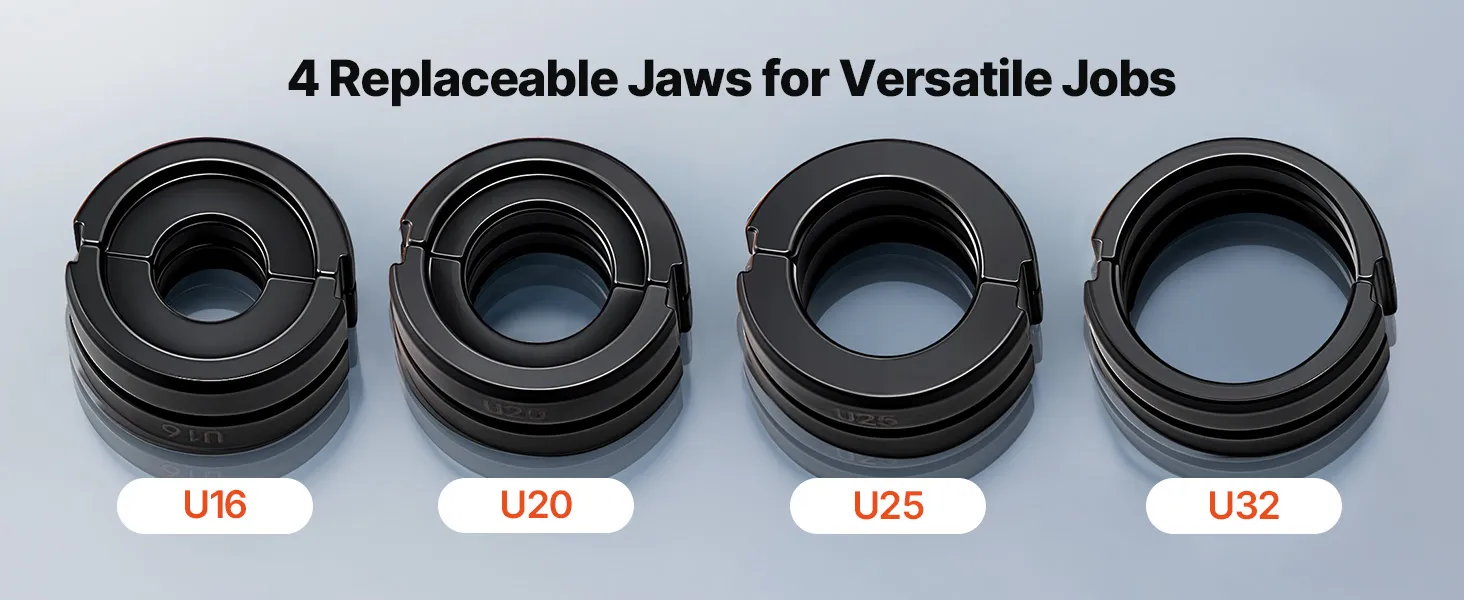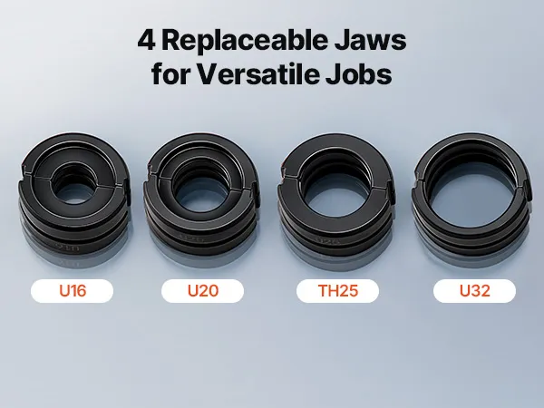 • 4 Versatile Jaw Sizes: This hydraulic pipe crimping tool, designed for PEX and Aluminum-Plastic pipes, includes 4 interchangeable crimping jaws (U16, U20, U25, U32), covering a range of pipe sizes to meet various crimping needs