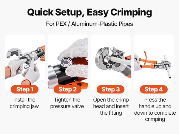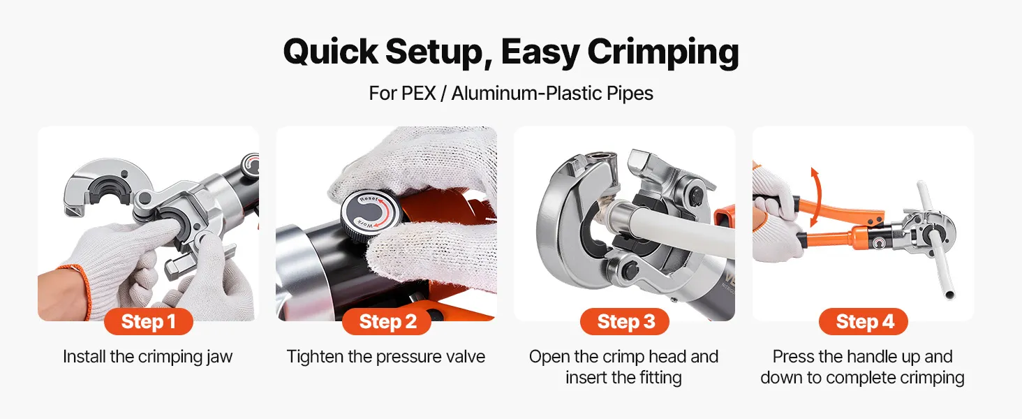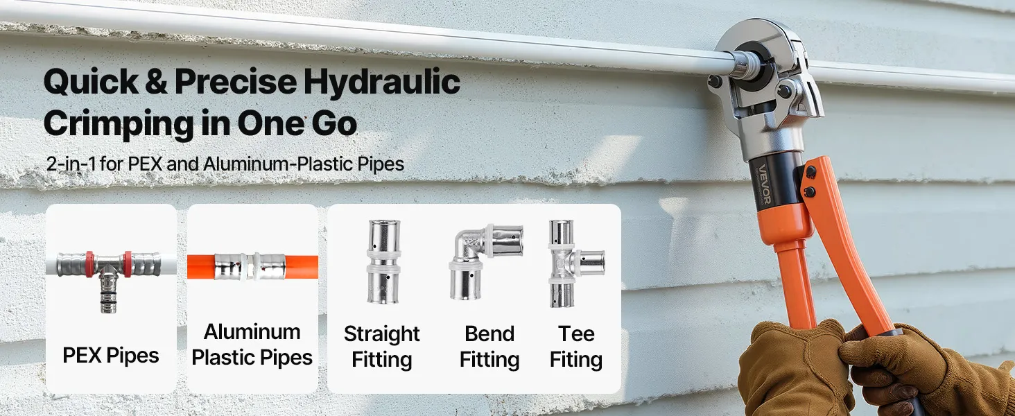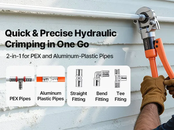 • Efficient and Effortless: Utilizing a high-efficiency hydraulic system, our PEX & aluminum-plastic tubing crimper delivers consistent, uniform pressure for fast, leak-free crimps — enhancing work efficiency and ensuring high-quality connections