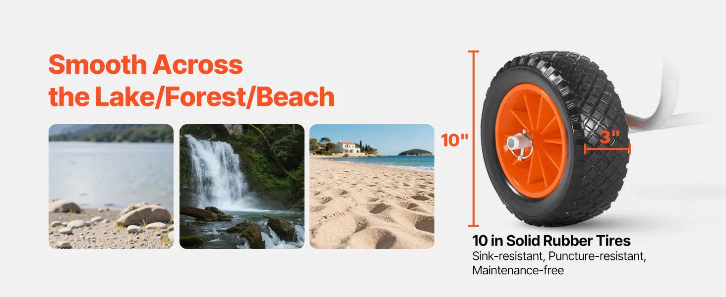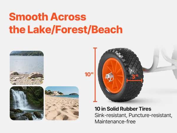 • Smooth Ride: Equipped with 10-inch solid rubber wheels and 3-inch wide tires, this kayak roller cart easily glides over sand, gravel, and grass. No air needed – enjoy a hassle-free, maintenance-free experience on any terrain