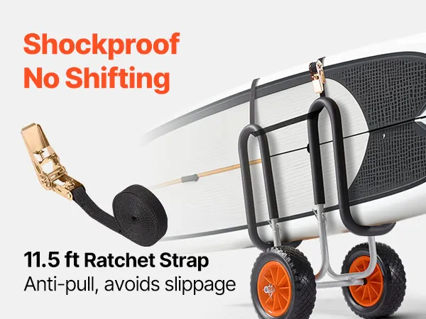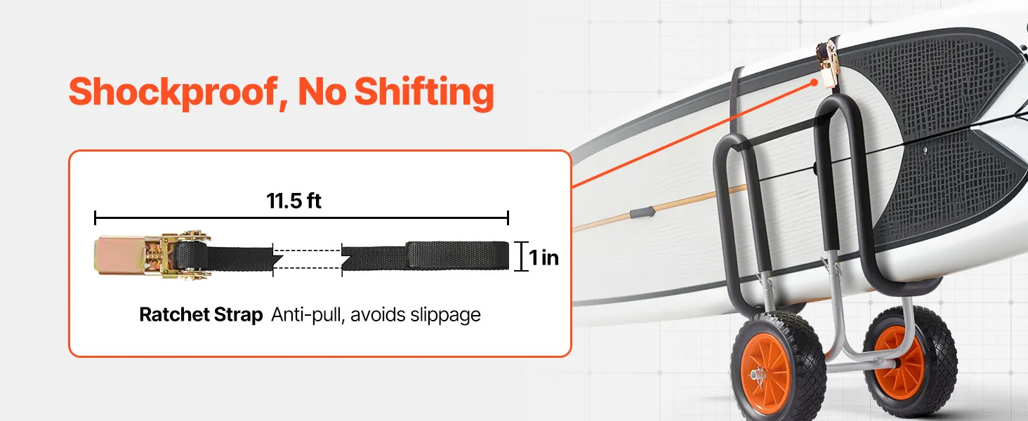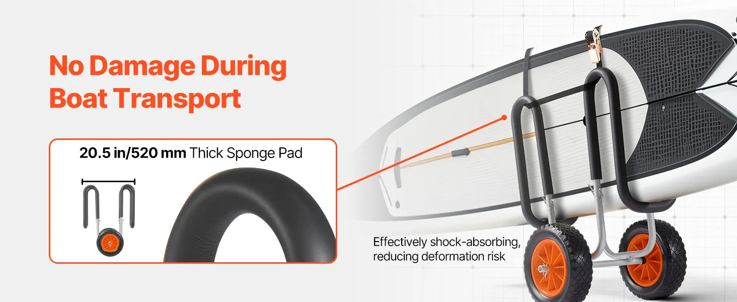 • Multi-layer Protection: Cushioning foam pads on the frame and a 3.6 m ratchet strap (25 mm wide) securely hold your boat in place. Therefore, our canoe cart dolly avoids sliding and minimizes potential damage during transport