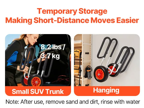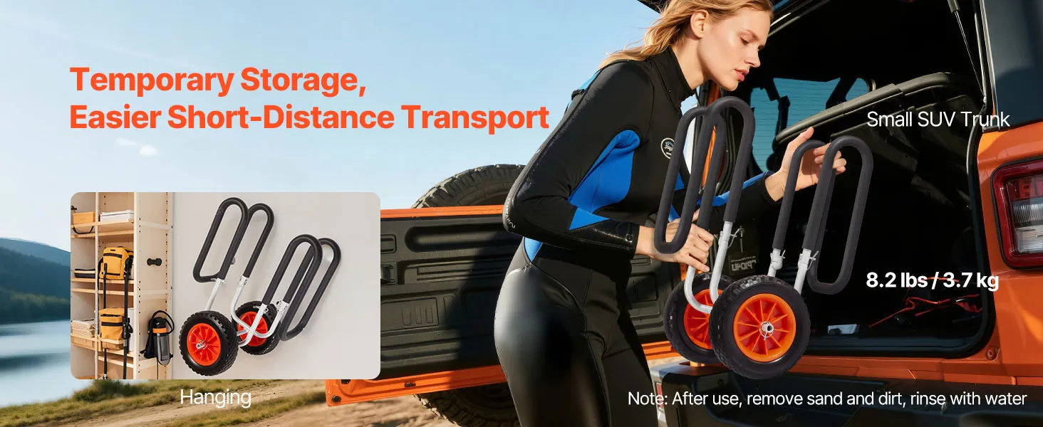 • Foldable and Compact: The lightweight design makes it easy to carry with one hand. The paddle board cart fits conveniently into your SUV trunk or boat storage area, ideal for easy transport or quick storage when not in use