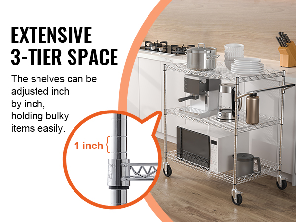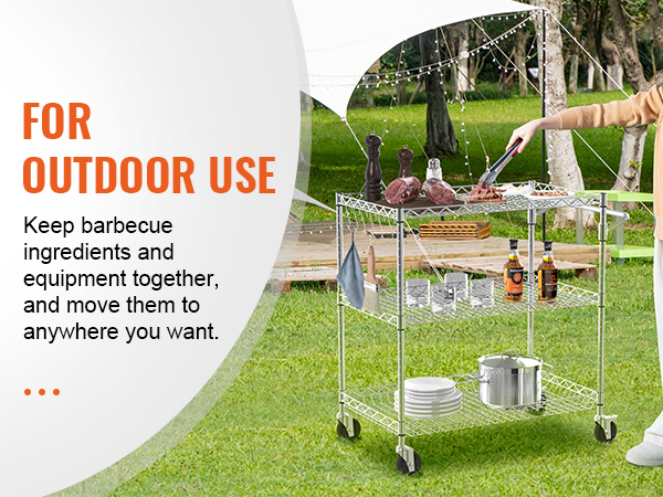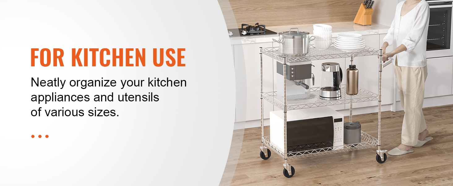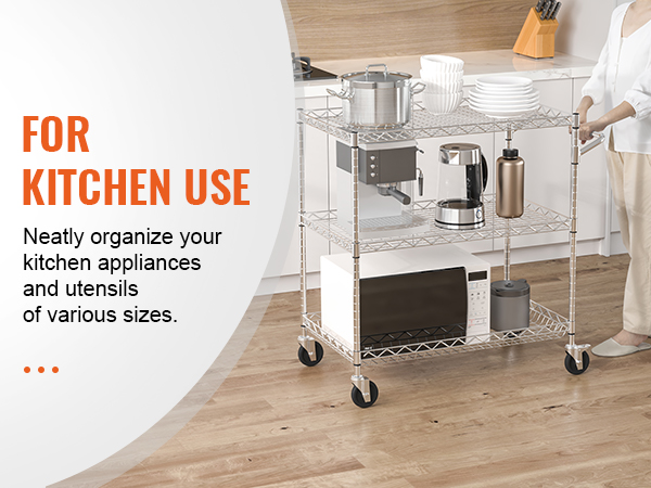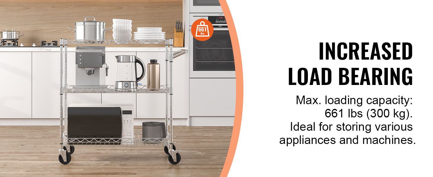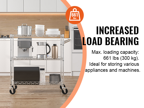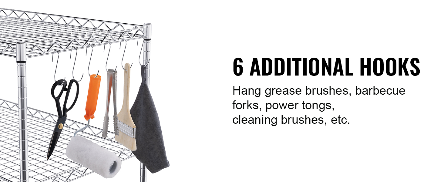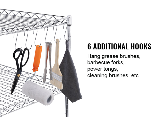 This 3-tier trolley can hold up to 661 pounds of heavy objects, and can hang various small items with 6 additional hooks. Large household appliances can also be easily stored thanks to the freely-adjustable shelves. It is perfect for kitchen, restaurant, hotel and outdoor use.