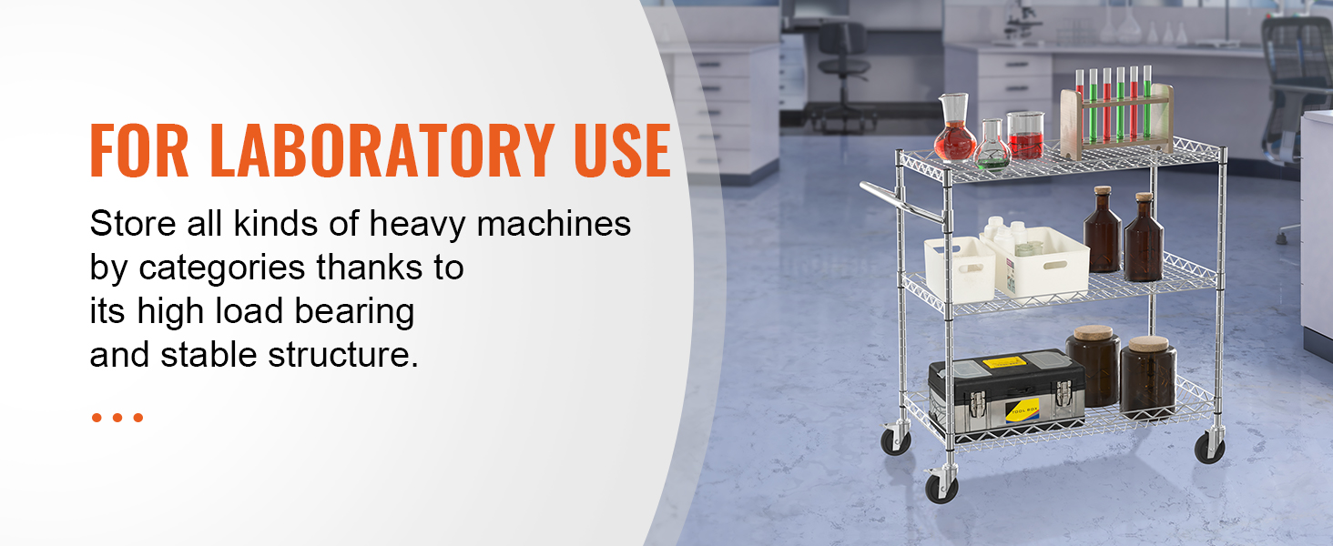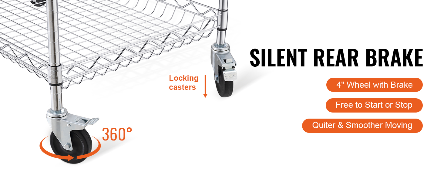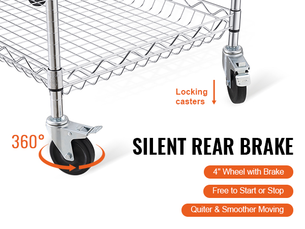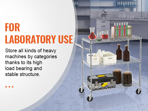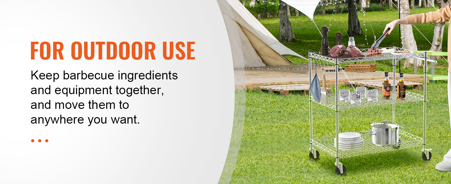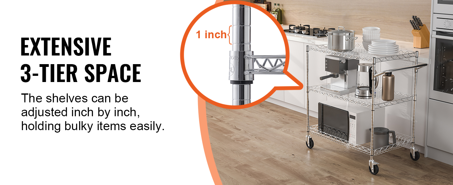 This 3-tier trolley can hold up to 661 pounds of heavy objects, and can hang various small items with 6 additional hooks. Large household appliances can also be easily stored thanks to the freely-adjustable shelves. It is perfect for kitchen, restaurant, hotel and outdoor use.