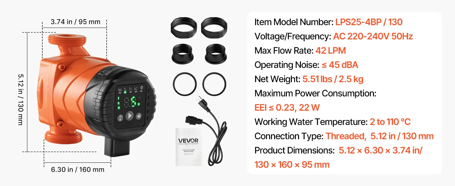 VEVOR LPS25-4BP/130 High Efficiency Circulator Pump, 42 LPM, 4 m Max Lift Cast Iron Hot Water Recirculating Circulation Pump, Threaded Connection, Check Valve, Quiet Operation, for Home Heating System