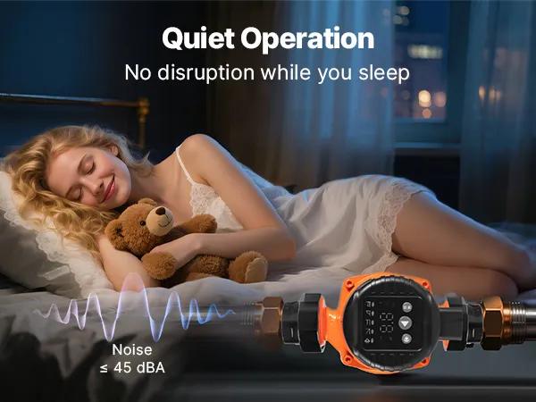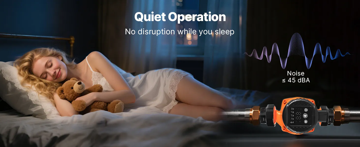 Operating at noise levels below 45 dBA, this hot water recirculating pump runs smoothly without disturbing household activities or rest. Suitable for nighttime use, it maintains a peaceful environment for the whole family.