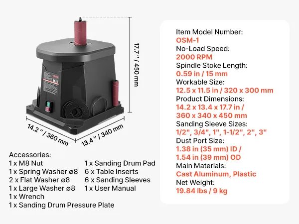 This benchtop spindle sander features a 2000 RPM high-speed motor, a 320 x 300 mm cast aluminum table, a 15 mm stroke length, and 6 sanding sleeves (12.7 mm, 19.05 mm, 25.4 mm, 38.1 mm, 50.8 mm, 76.2 mm) for efficient sanding.